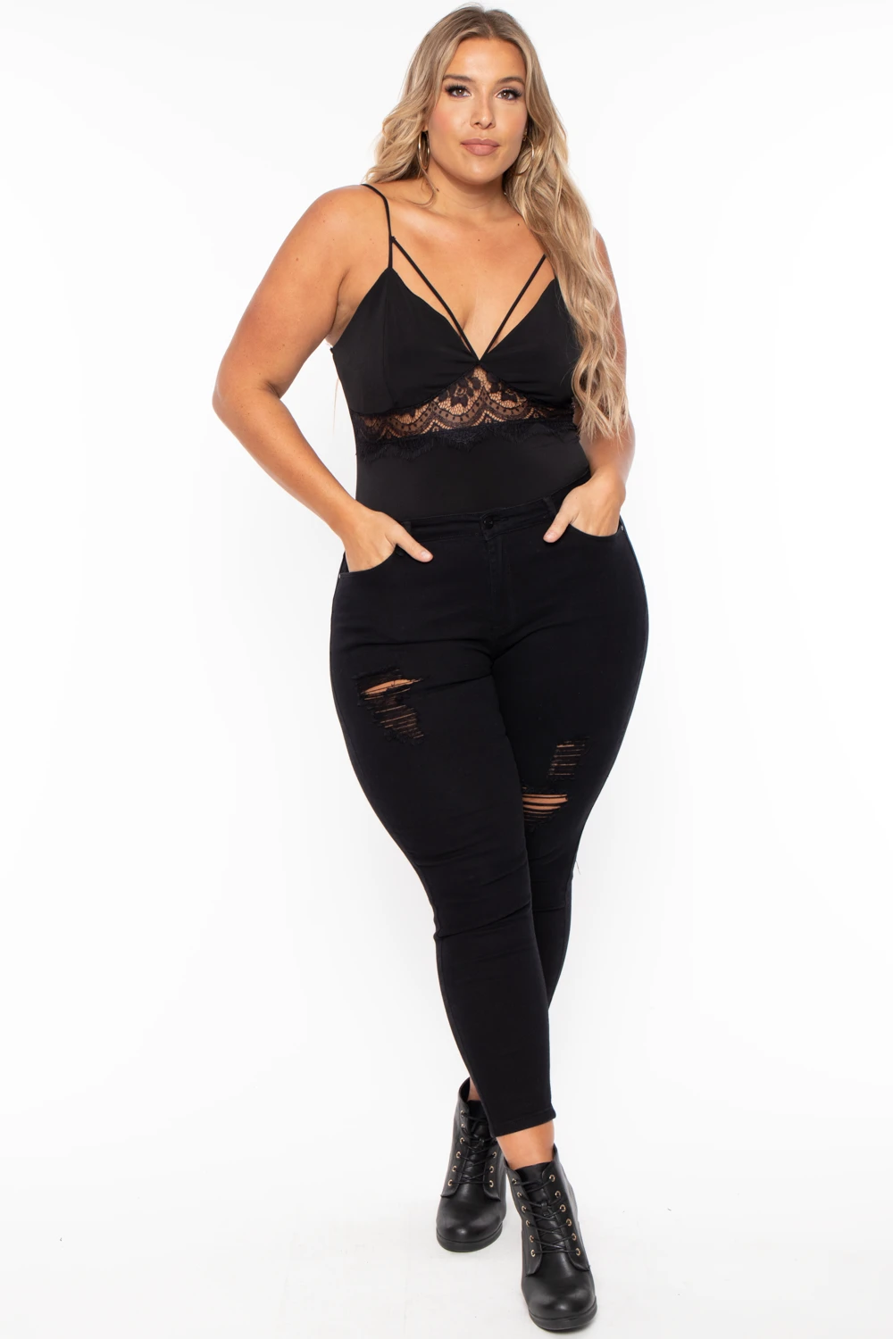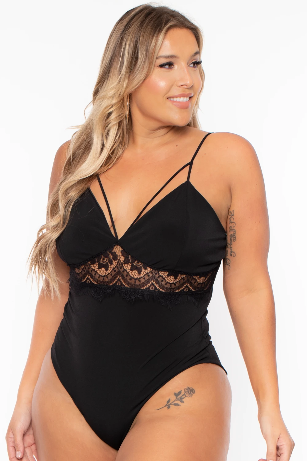This plus size, extra stretch knit bodysuit features a plunging V-neckline with a strappy detail, a lace inset below the neckline, a sleeveless cut, and a snap-button closure.