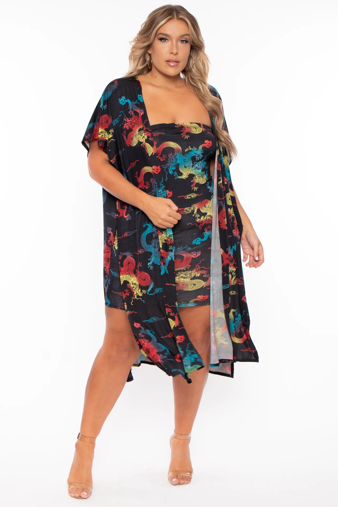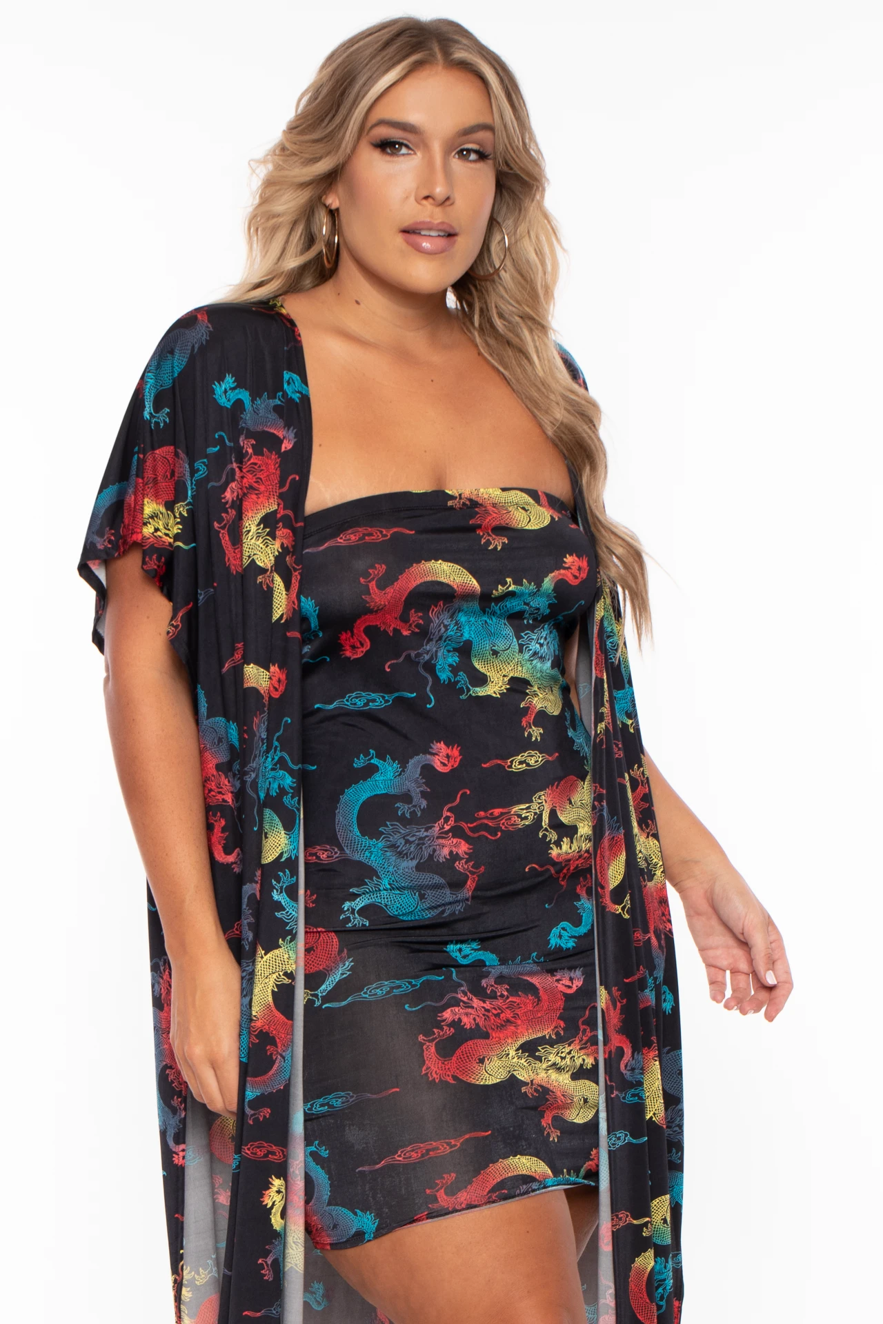 This plus size, 2 piece ensemble set features a tube mini dress with elastic neckline for better support and a matching kimono front open side slits, and flare hem. Matching set with all-over dragon print.