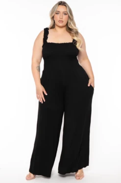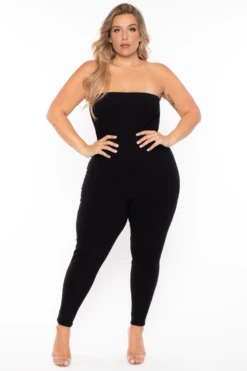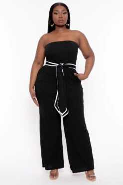 This plus size, strapless pant jumpsuit features a deep mini v neckline, belted sash, and chiffon skirt overlay