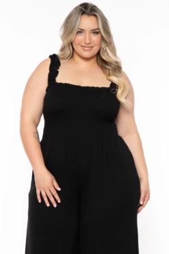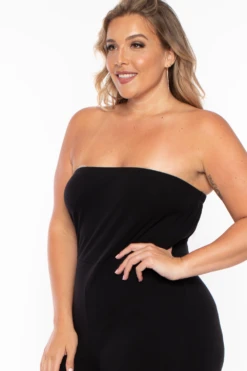 This plus size, strapless pant jumpsuit features a deep mini v neckline, belted sash, and chiffon skirt overlay