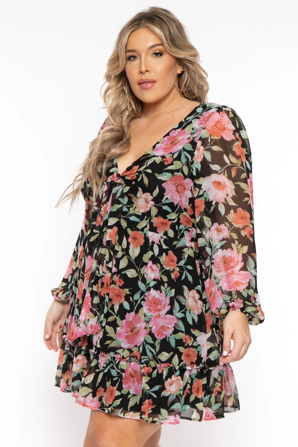 This plus size dress features an all over floral print, a v-neckline, front self tie, long sleeves, elasticized waistline, keyhole back with dome button closure, inner lining, ruffle hem, and a flowy mini length silhouette.