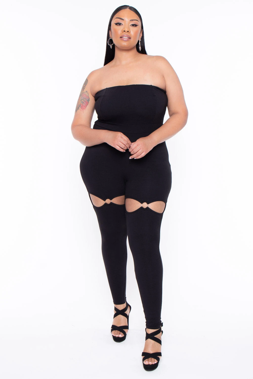This plus size, jumpsuit is perfect for dancing all night! Alessa features a strapless, curvy-hugging silhouette, and sexy cut outs with silver ring detail