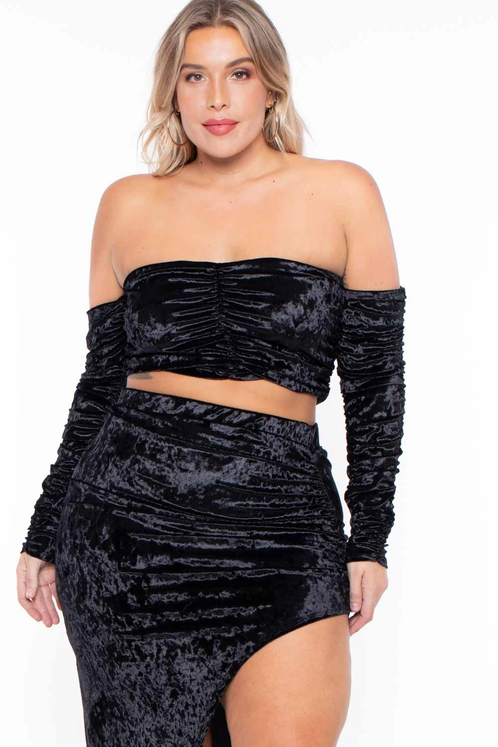 This plus size velour matching set features a strapless neckline, attached long sleeves, and cropped hem with front ruched detail, as well as a long asymmetrical cut skirt with a slit to the front hem giving a very sexy bodycon silhouette
