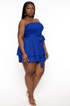 This plus size, jumpsuit features off the shoulder neckline with a pleated detail, a u wire at the bust, back zipper, with a fit and semi flare bottom legs and great stretch.