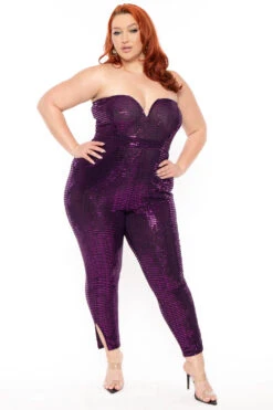 This plus size, jumpsuit features off the shoulder neckline with a pleated detail, a u wire at the bust, back zipper, with a fit and semi flare bottom legs and great stretch.