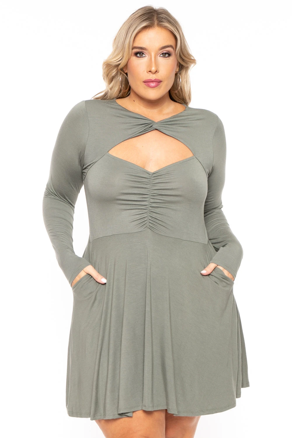 This plus size stretch knit dress a twist front cutout mini v-neck, front ruched detailing, long sleeves, pockets, is a flowy flare hem.