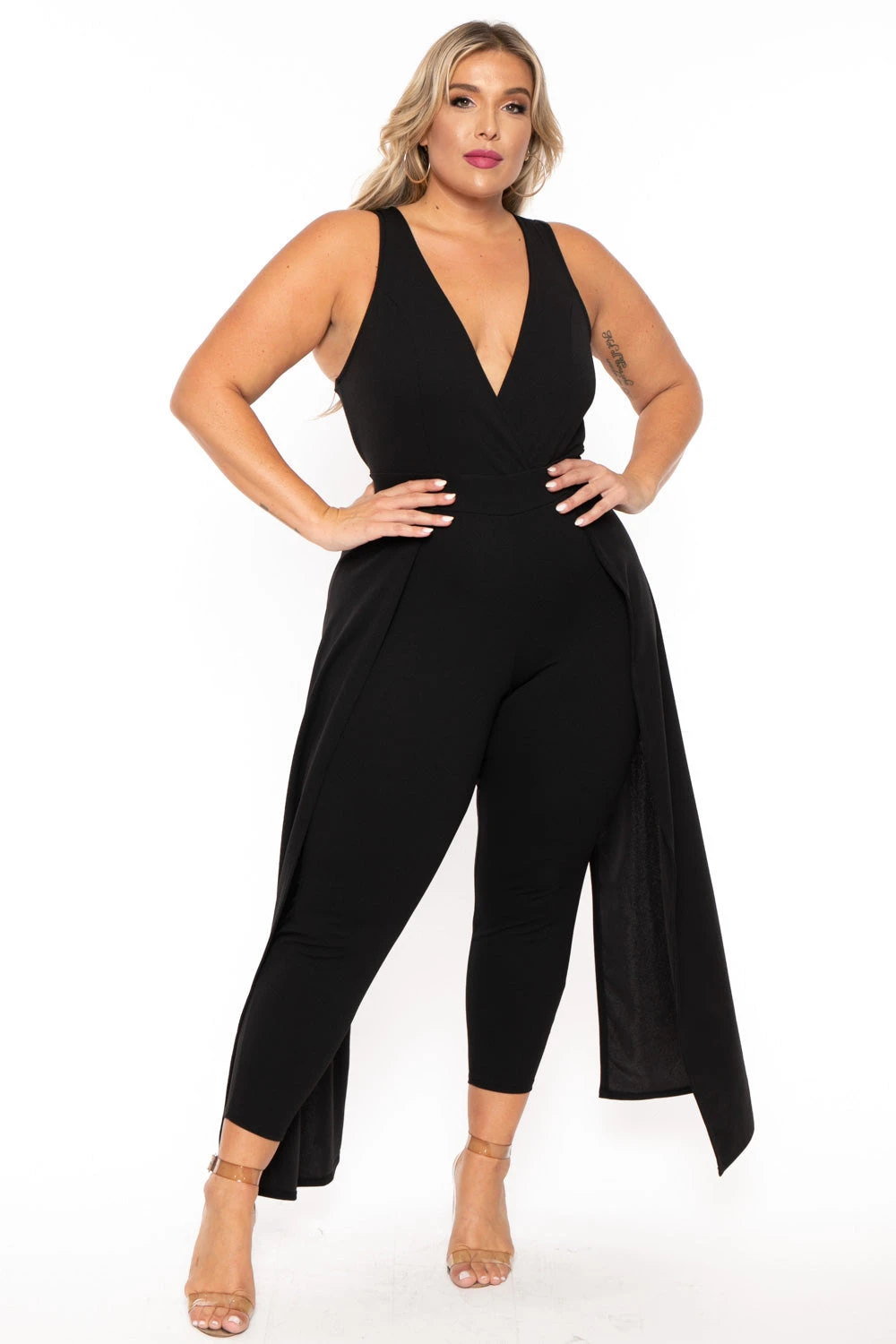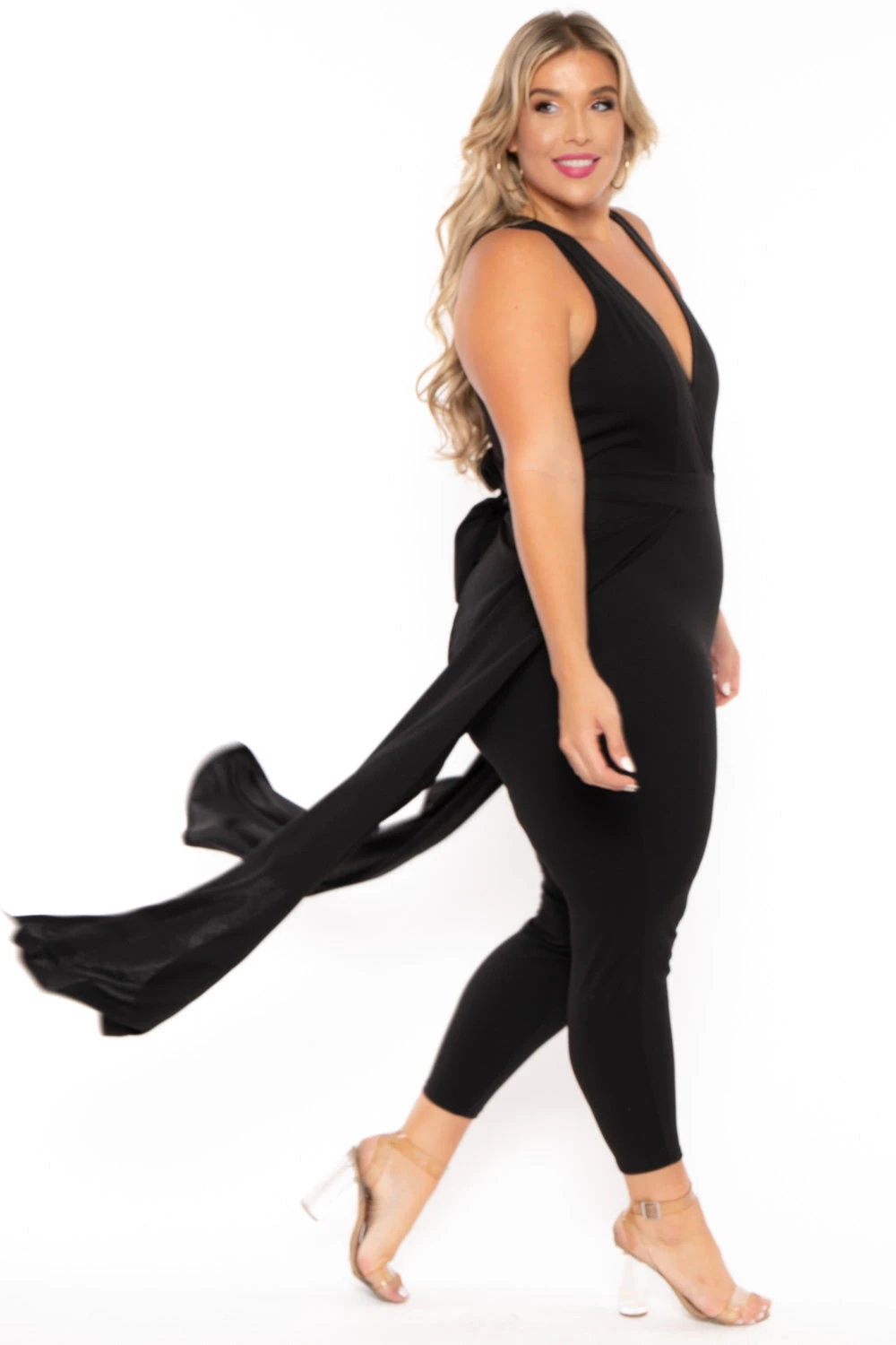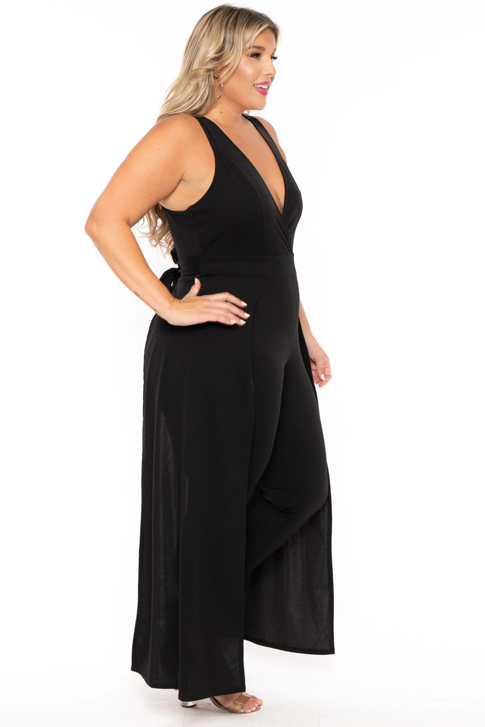 This plus size sleeveless jumpsuit features a plunging v-neckline, self tie belt, keyhole cutout in the back with dome button closure, skinny leg pant with sides overlay