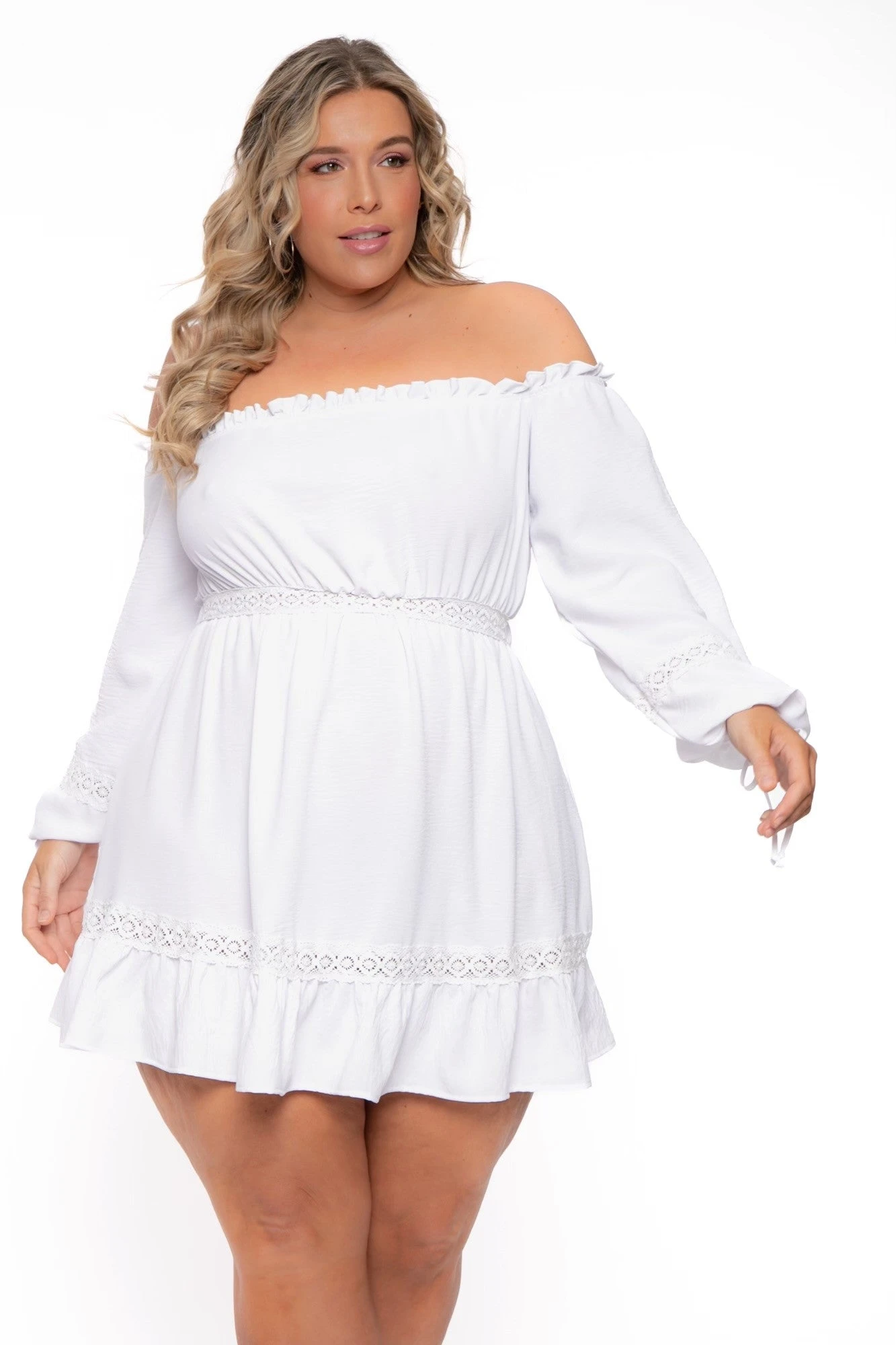 This plus size dress features an off the shoulder neckline, long sleeves, elasticized waistline, crochet detail and a flowy mini length silhouette.