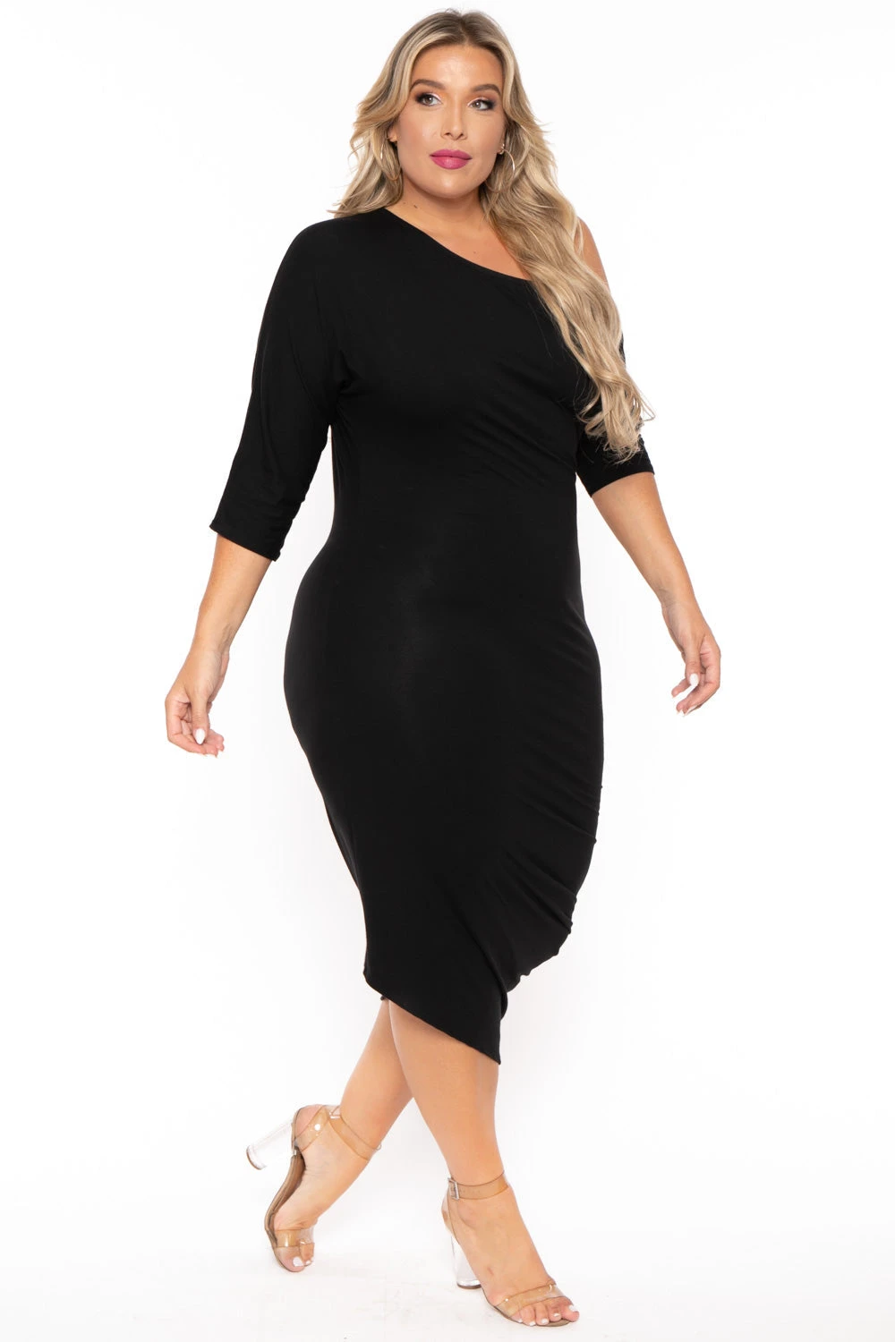 This plus size, stretch knit dress features a round off one shoulder neckline, 3/4 sleeves, an asymmetric hem, and a bodycon silhouette.