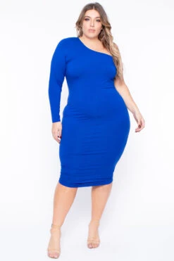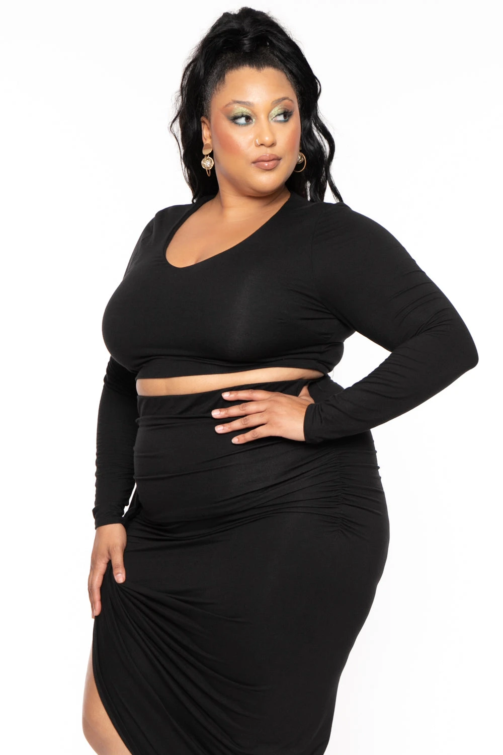 This plus size stretch knit cute two-piece set features a top with a scoop neckline, long sleeves, has an elastic waist for added comfort, an asymmetrical hem, and form fitting silhouette This cute matching set is perfect to dress up or down!