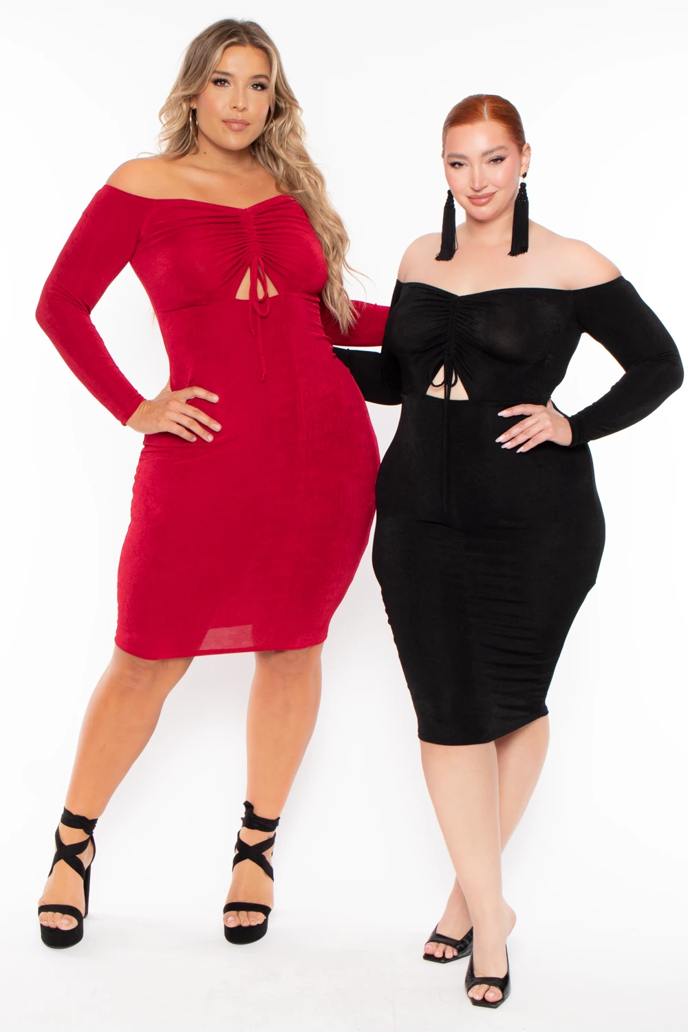 This plus size, long sleeve off the shoulder LBD features ruching details and front cut out with drawstring.