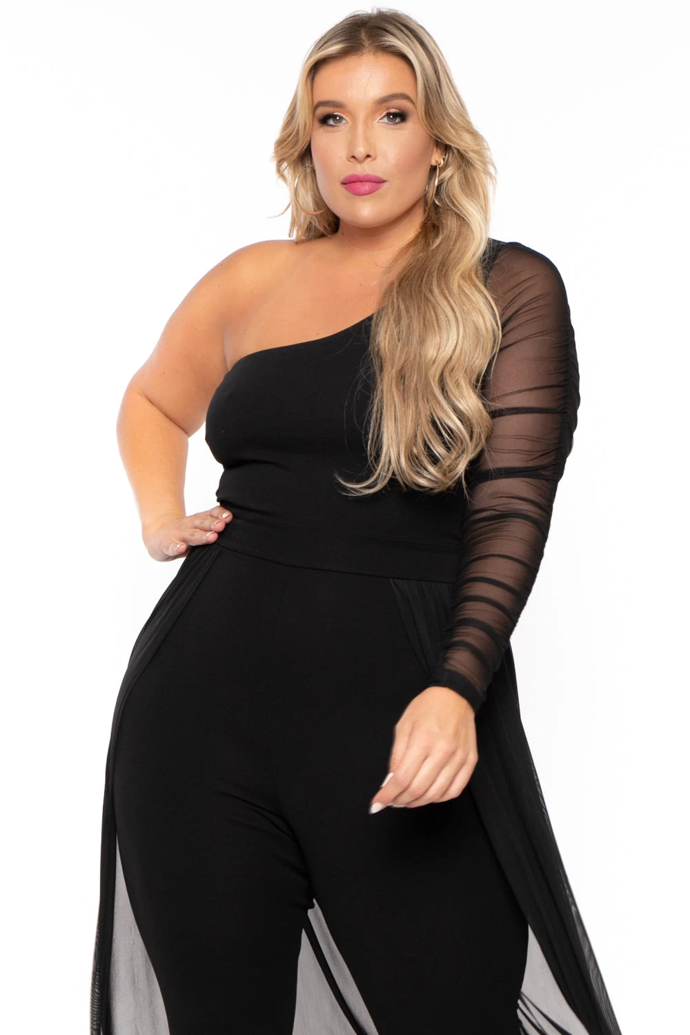 This plus size jumpsuit features a one shoulder neckline, ruching sleeve detail, belted sash, and mesh skirt overlay