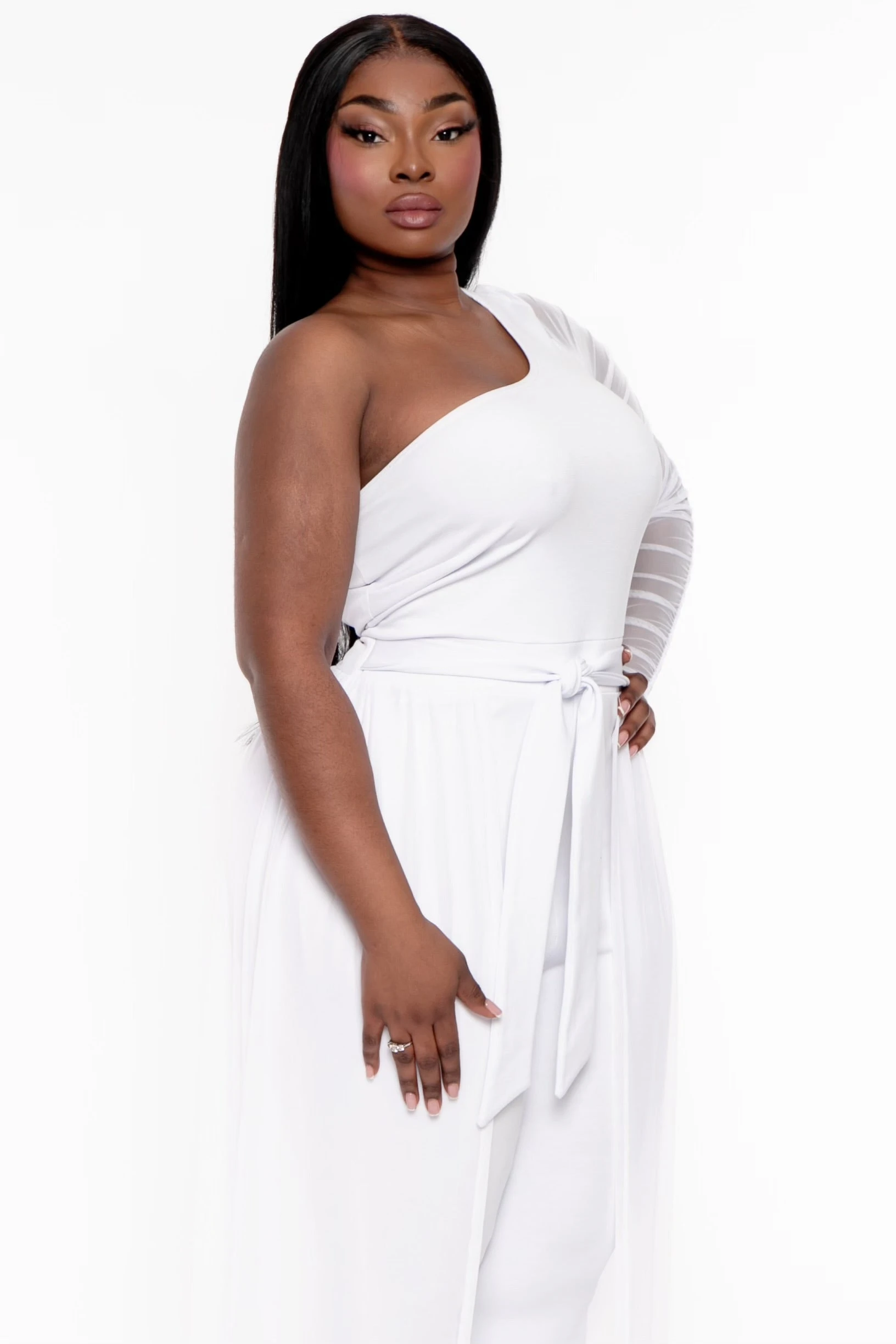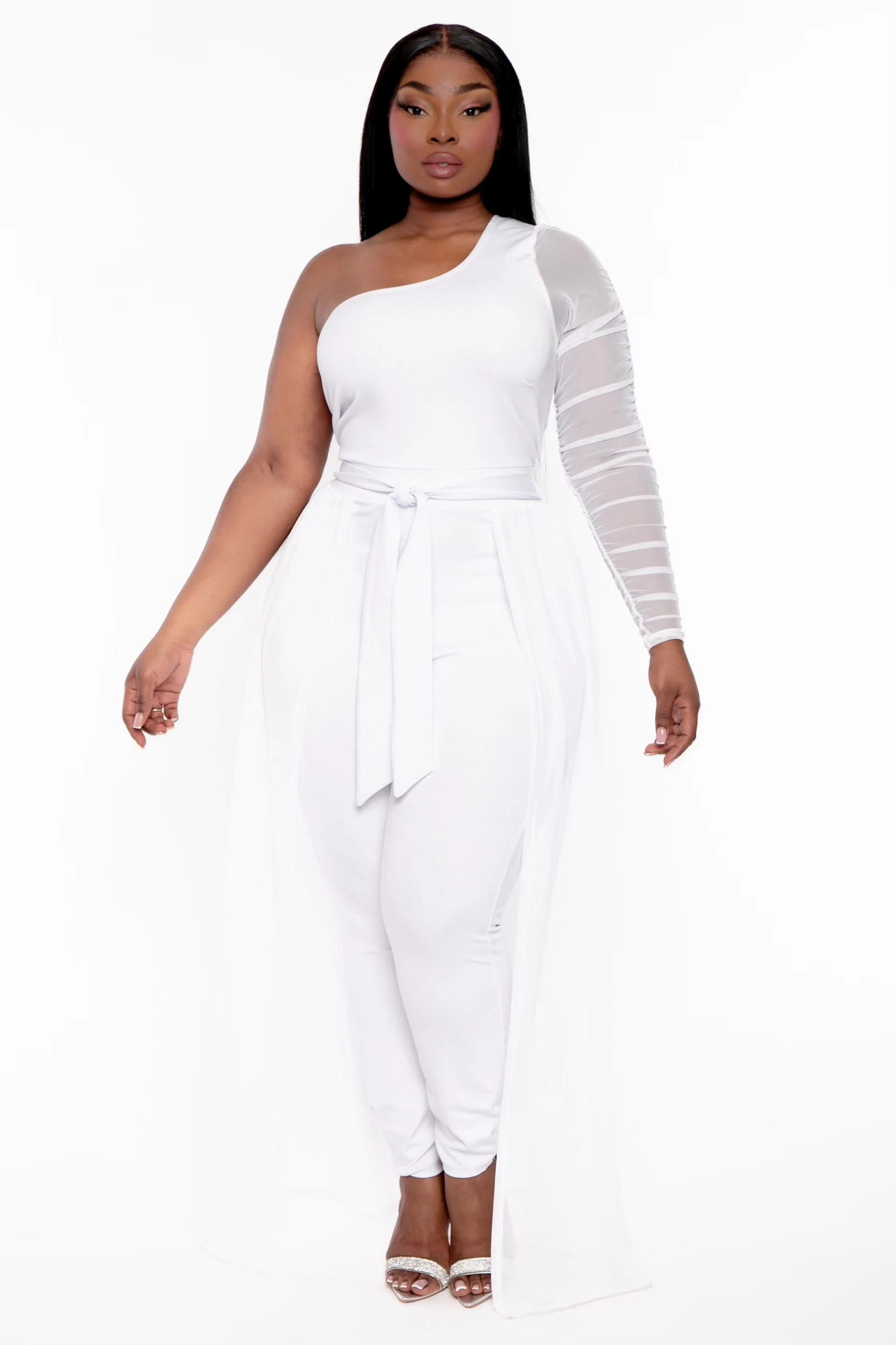 This plus size jumpsuit features a one shoulder neckline, ruching sleeve detail, belted sash, and mesh skirt overlay