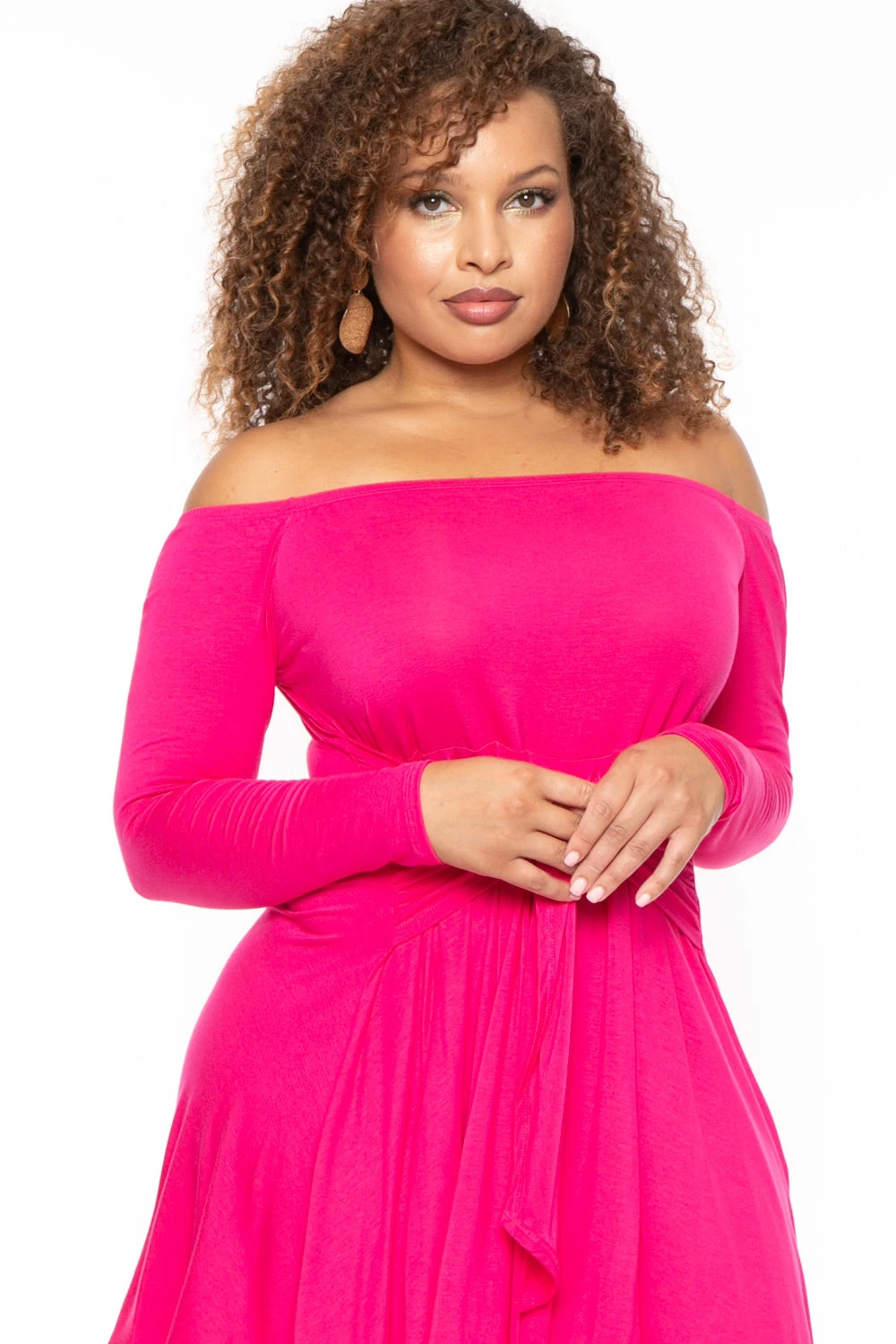 This plus flare dress features a straight neckline, off the shoulder, long sleeves, a wrap overlay that ties at the front.