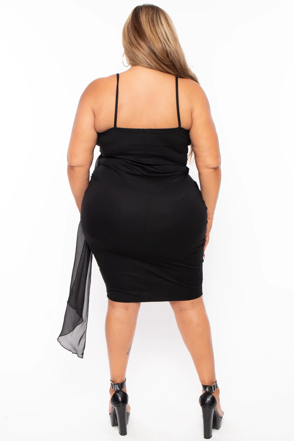 This plus size stretch knit dress features a v-neckline with a cross front style, cami straps, princess seams, a sleeveless cut, a belt with sash detailing, light pleating, and a bodycon silhouette.