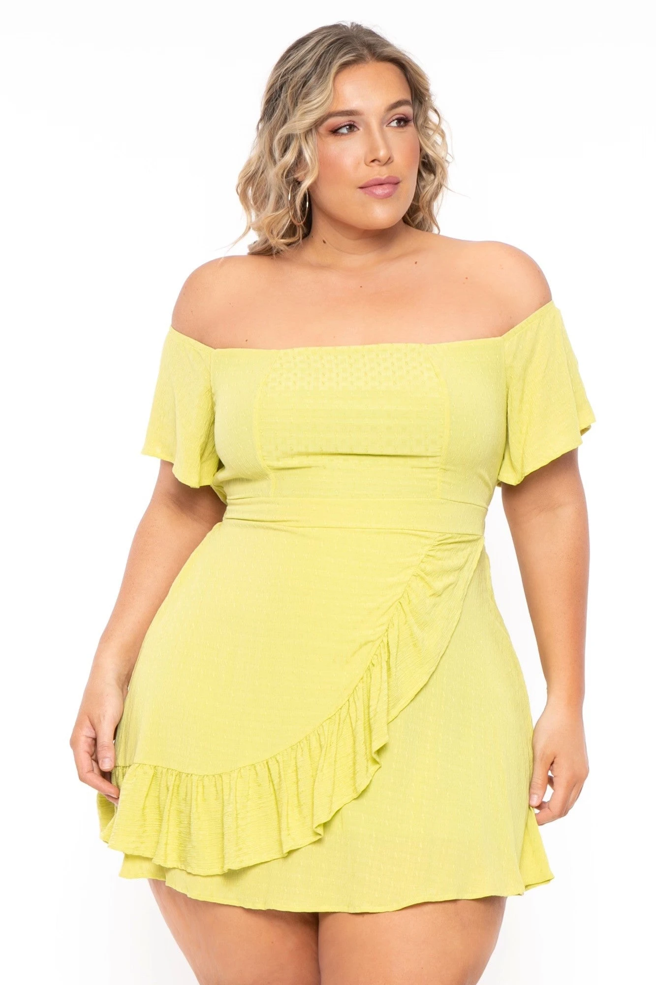 This plus size woven dress features an off the shoulder neckline, short sleeves fully lined elastic waistline and a tulip ruffle hem.