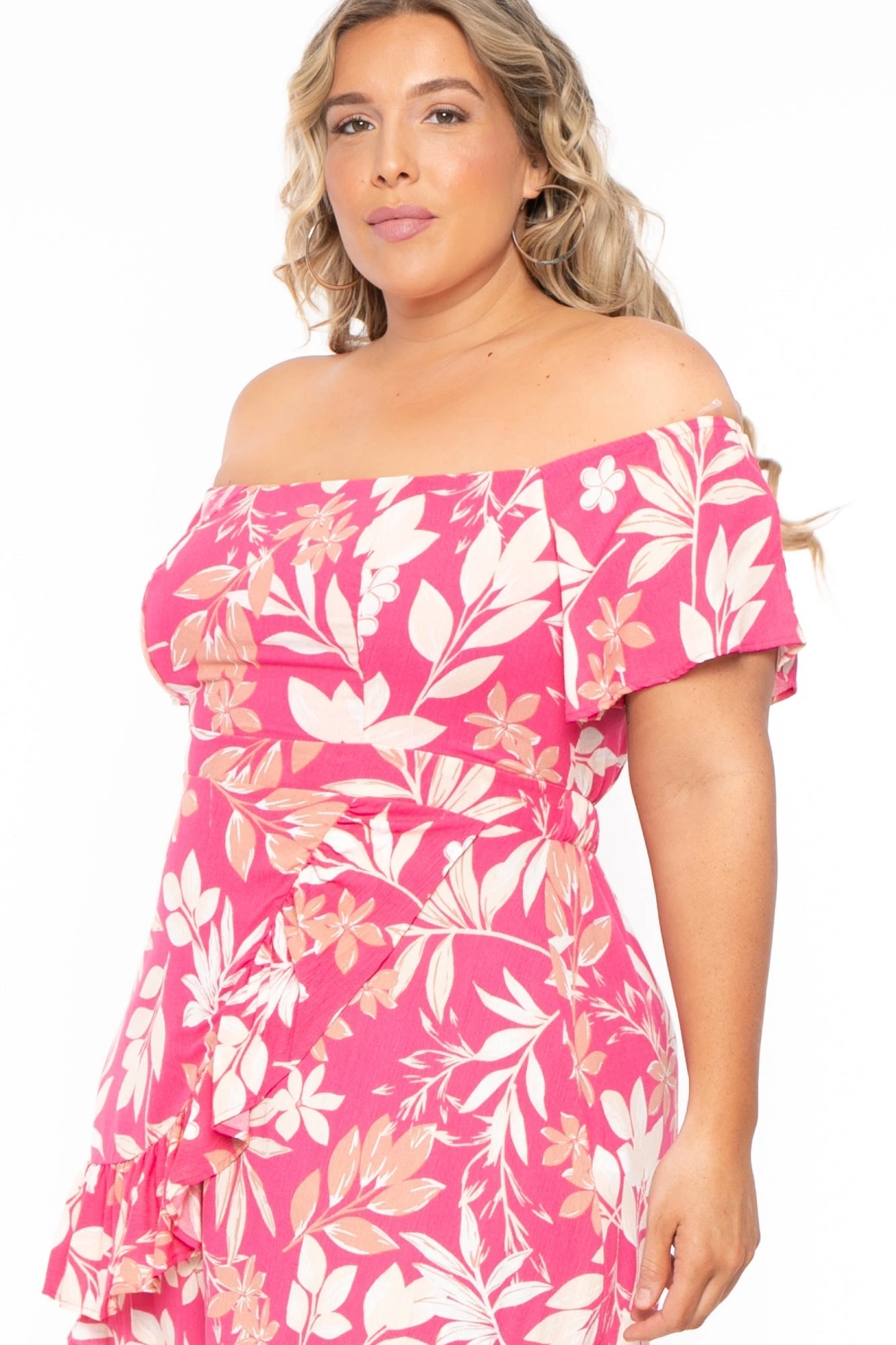 This plus size woven dress features an all over leaf print, a off the shoulder neckline, short sleeves fully lined elastic waistline and a tulip ruffle hem.