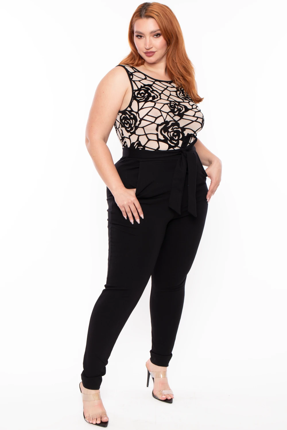 This plus size stretch knit jumpsuit features a round neckline with a contrast burn out floral flocked detail, sleeveless, banded waist with attached self tie belt, back keyhole with button closure, side pockets, and a skinny leg.