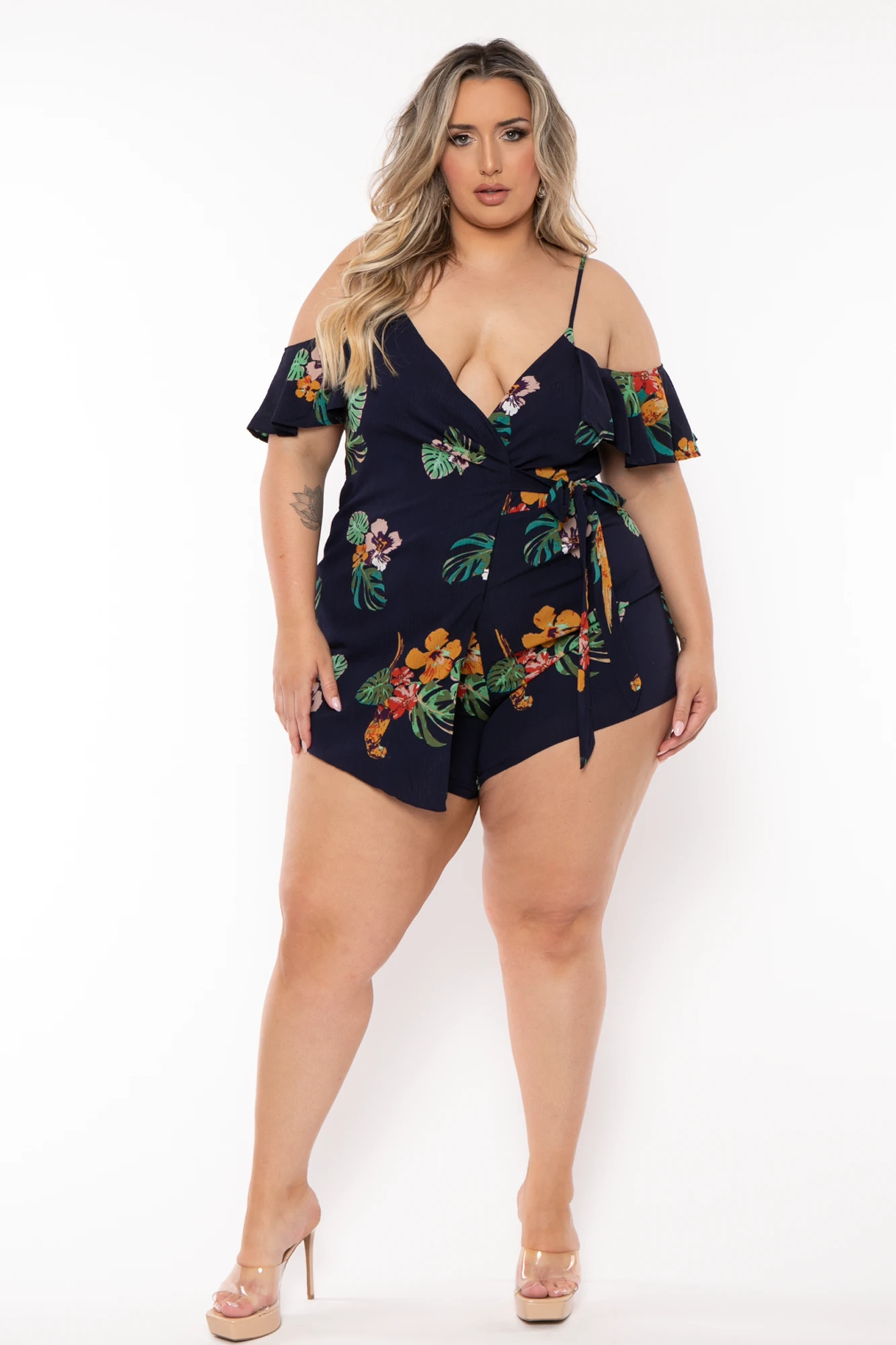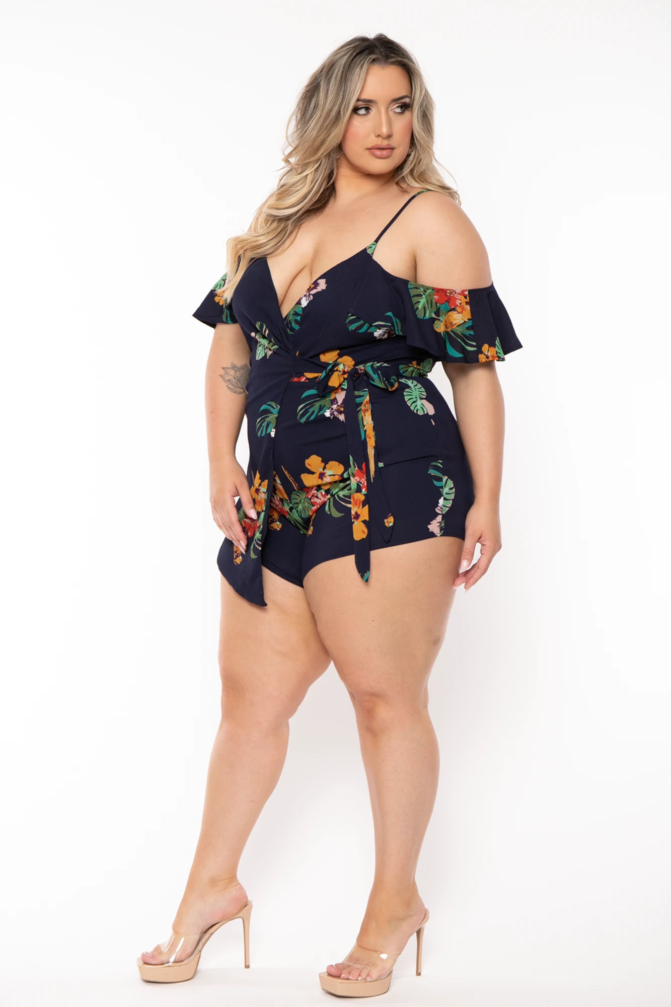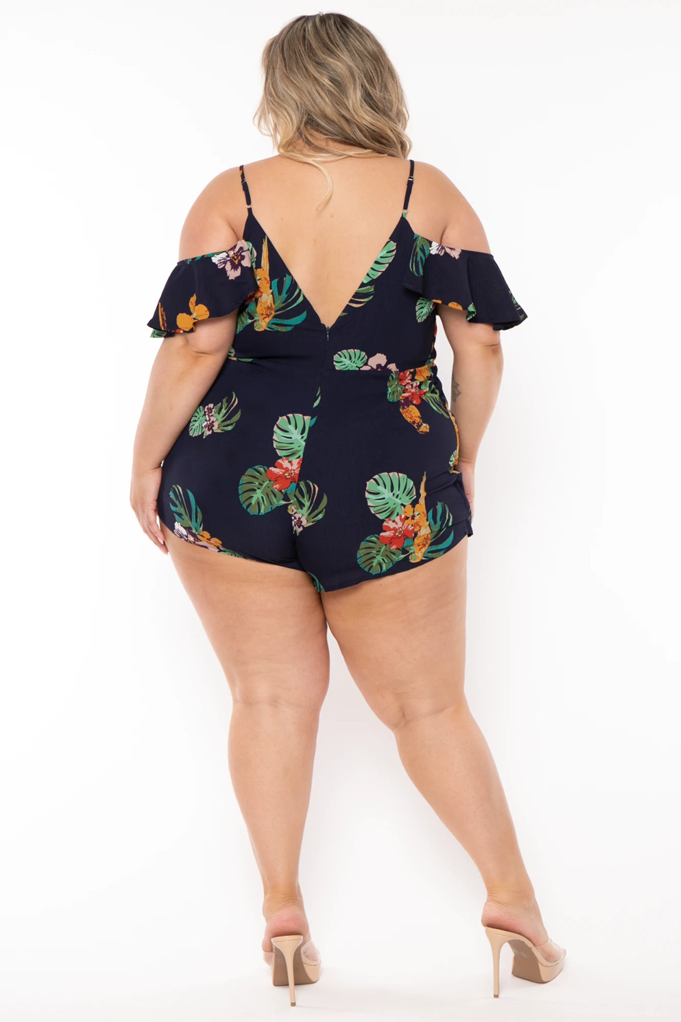 This plus size, romper features a tropical all over print , a ruffle cold shoulder cross front V neckline, with a side tie, back zipper and adjustable straps