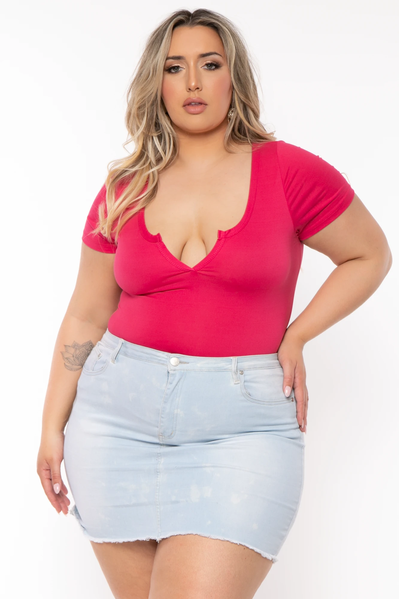 This plus size, stretch knit bodysuit features, in split v-neck style, fitted, short sleeves and snap button closure.