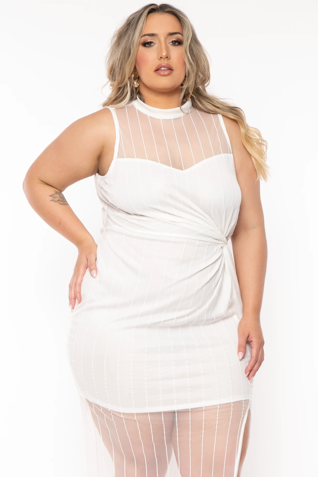 This plus size stretch dress features a halter-neck, key hole back with dome buttons closure, sleeveless, a linen bodice with a striped mesh fabric, twist knot detail, and a slit.