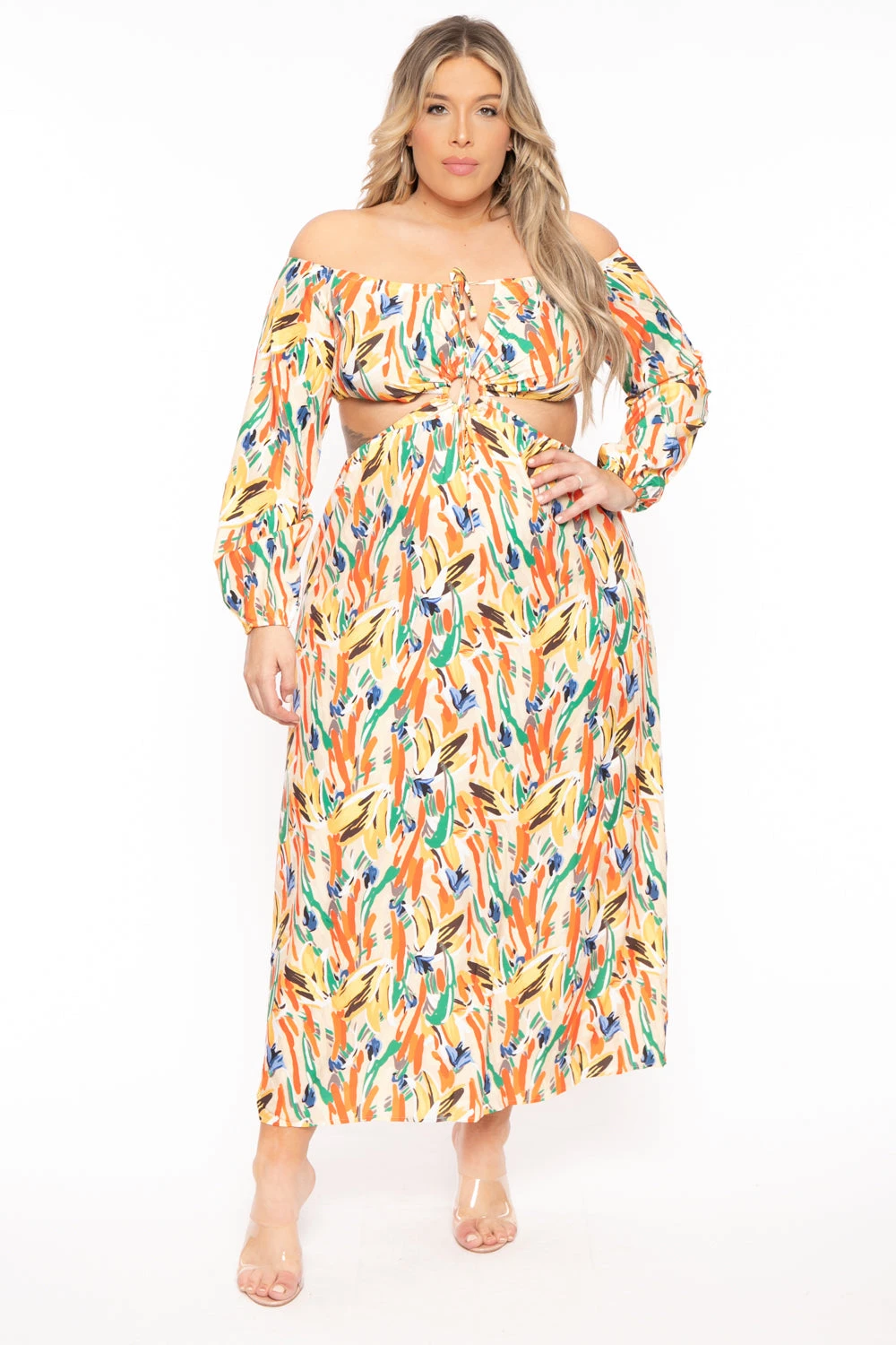 This plus size dress features a off the shoulder neckline, O’ring detail, long sleeves, cut out waist,