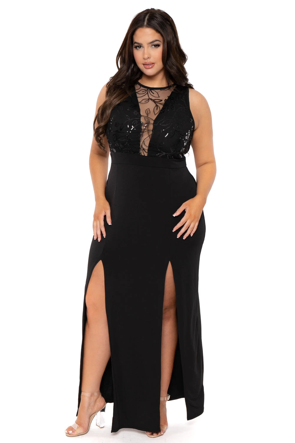This plus size, maxi dress features the M-slit design, sequin mesh bodice with deep neckline and curve hugging silhouette