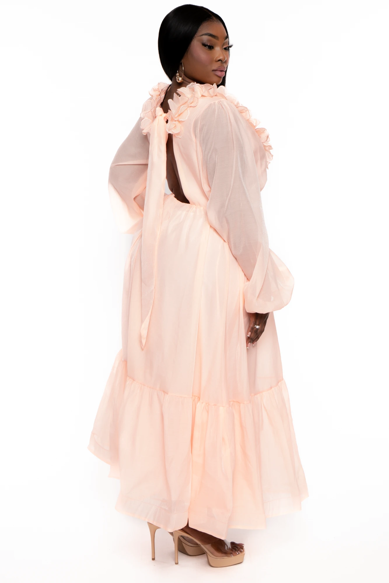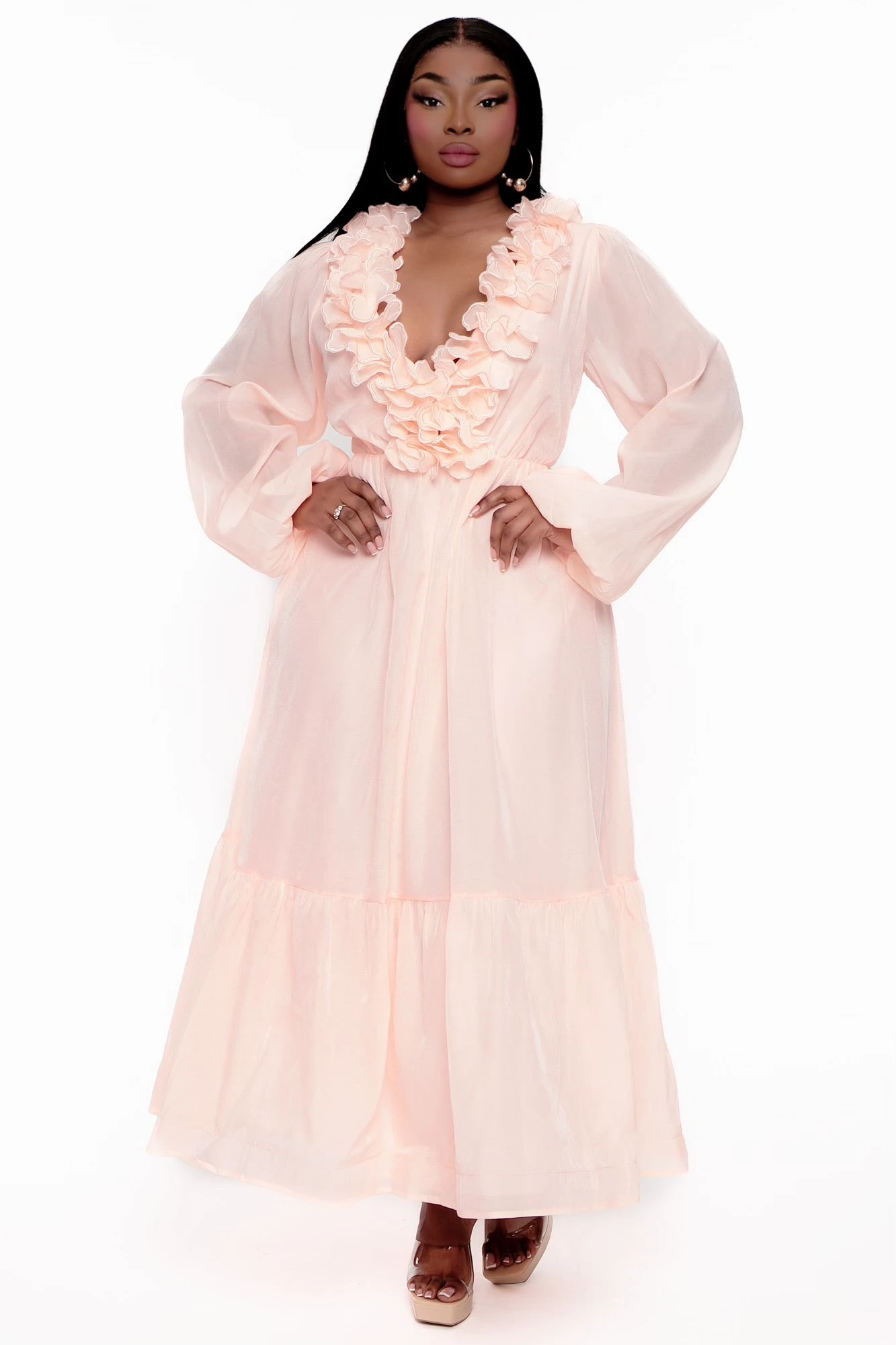 This plus size, Maxi dress features a v-neckline with a ruffle detail, and long sleeves with elastic hem the back has a smocked detail and lover back cutout, the skirt is layered detail and maxi dress length..