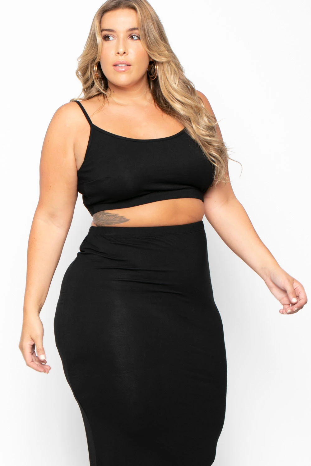 This plus size, stretch two-piece set features a crop top with a scoop neckline, cami straps, elastic ribbed crop hem, a matching skirt with an elastic waist, and form fitting silhouette
