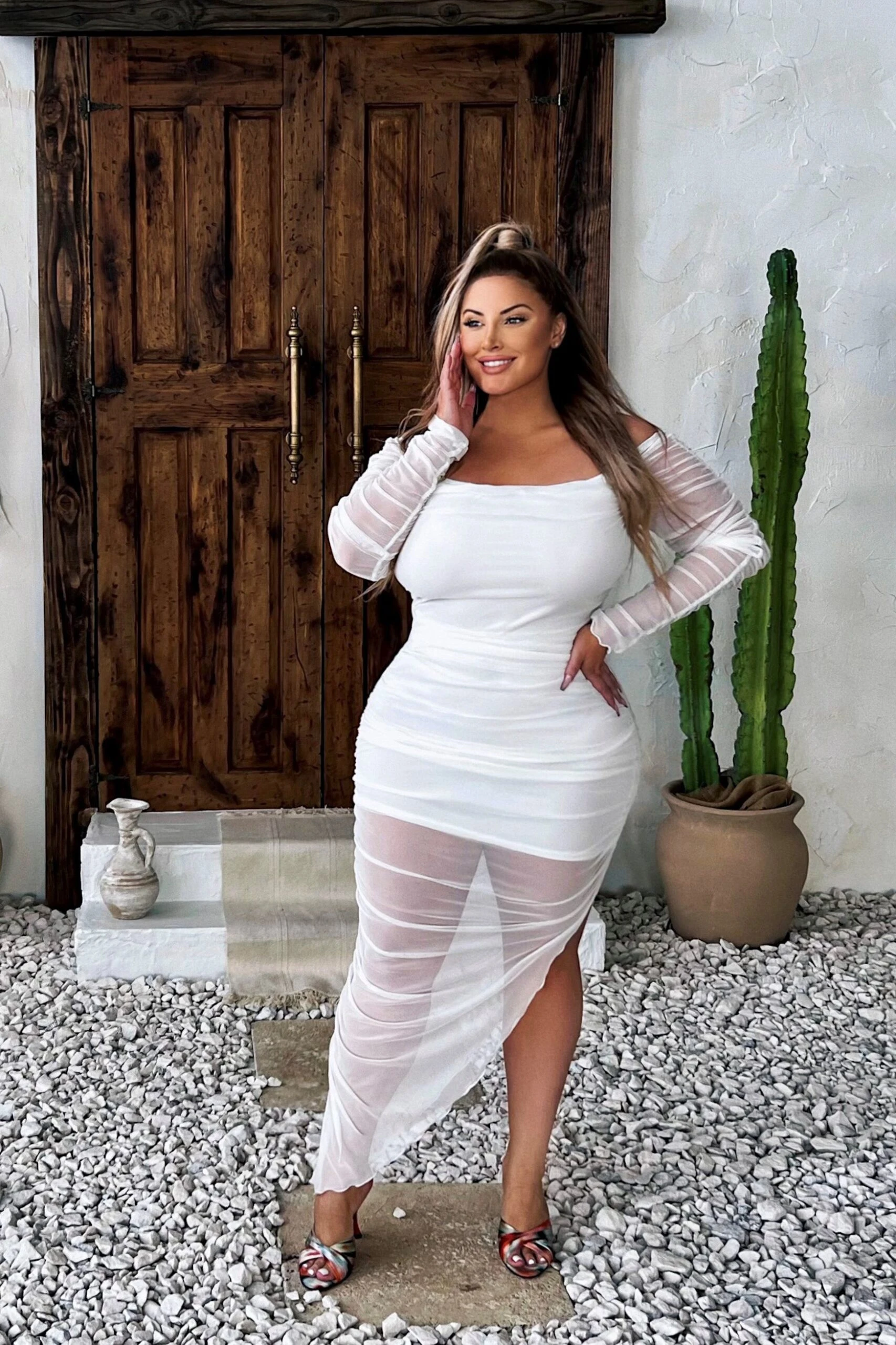 This plus size, bodycon dress features a mesh overlay dress with a curve hugging silhouette, fully lined, off the shoulder neckline, long sleeves, ruching and asymmetric hem