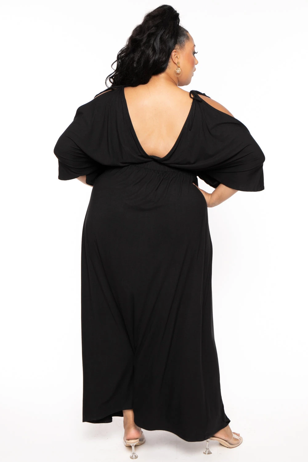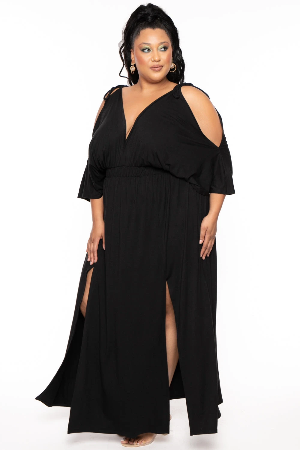 This plus size, stretch knit maxi dress features a plunging surplice v-neckline, self tie straps in a cold shoulder 3/4 sleeve, elasticized waistline, and front M-slit.