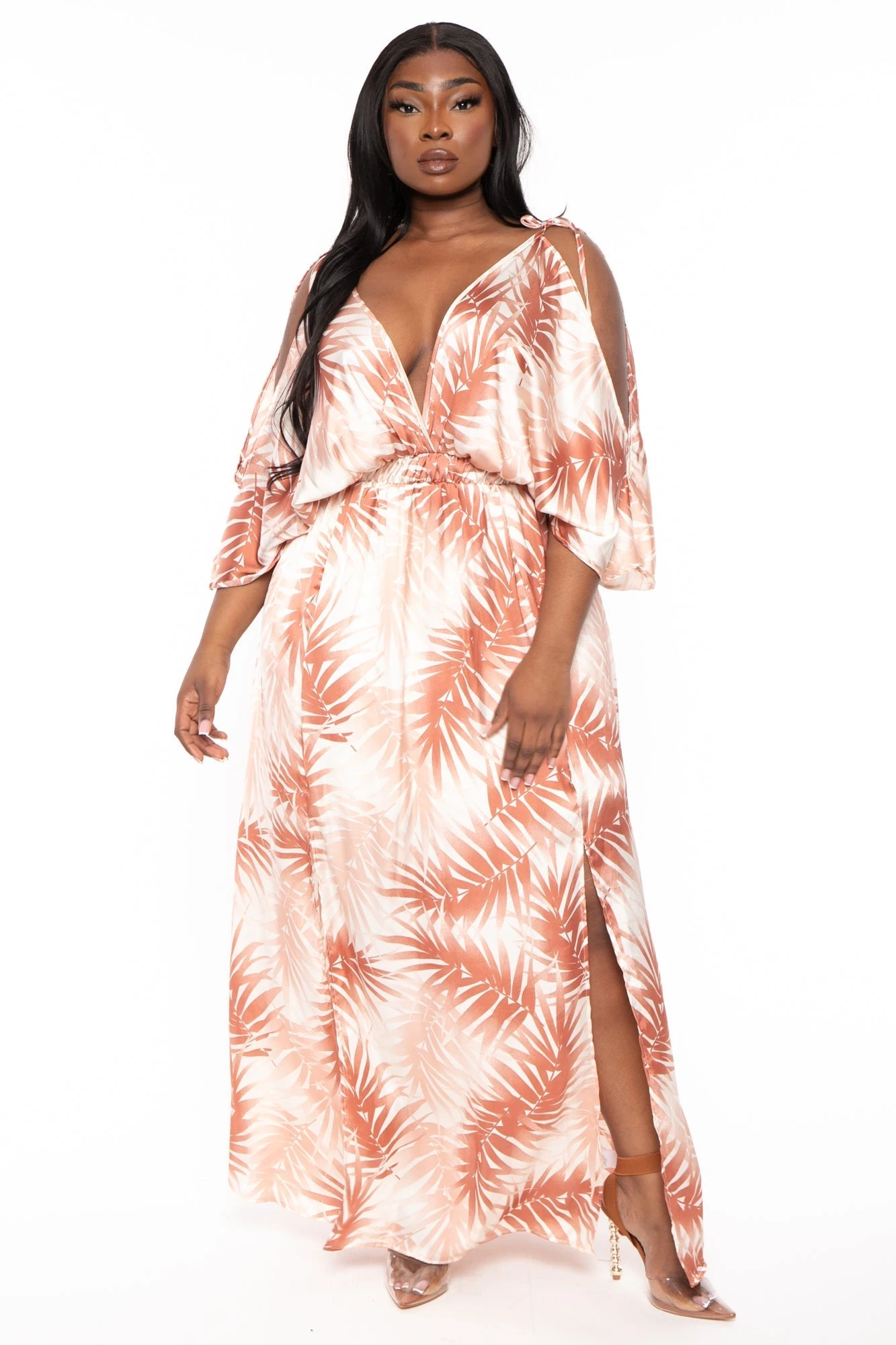 This plus size, satin maxi dress features a plunging surplice v-neckline, self tie straps in a cold shoulder 3/4 sleeve, elasticized waistline, mini skirt lining and front M-slit.