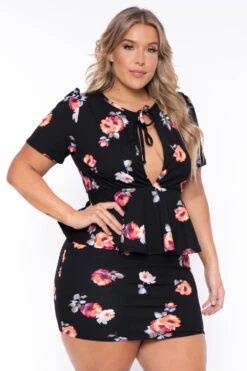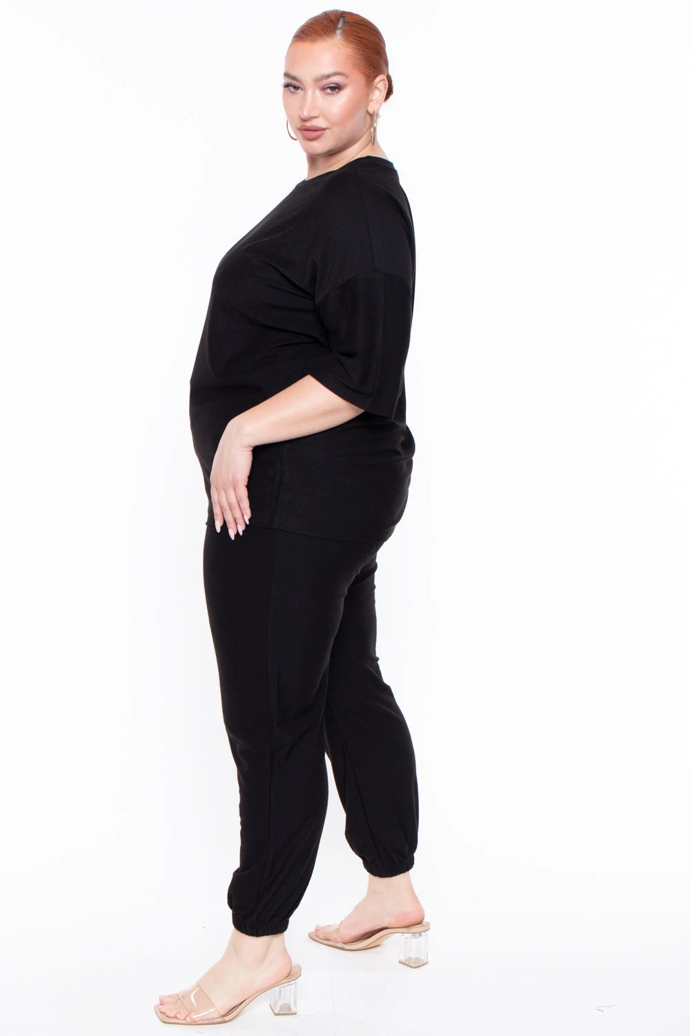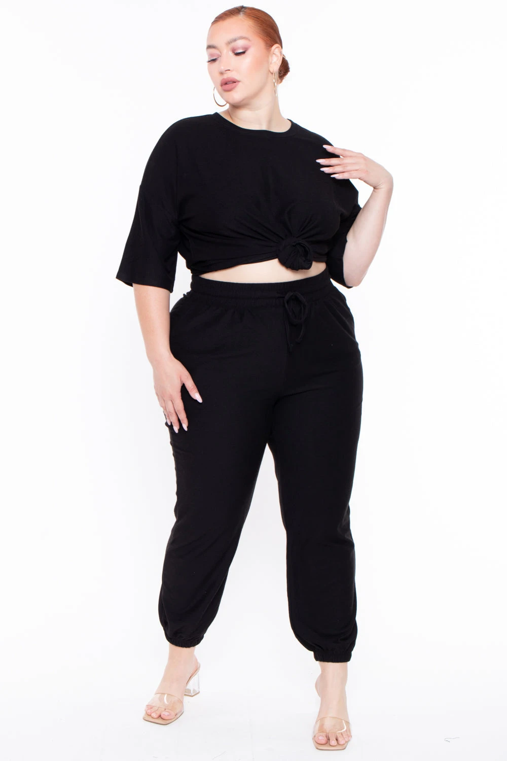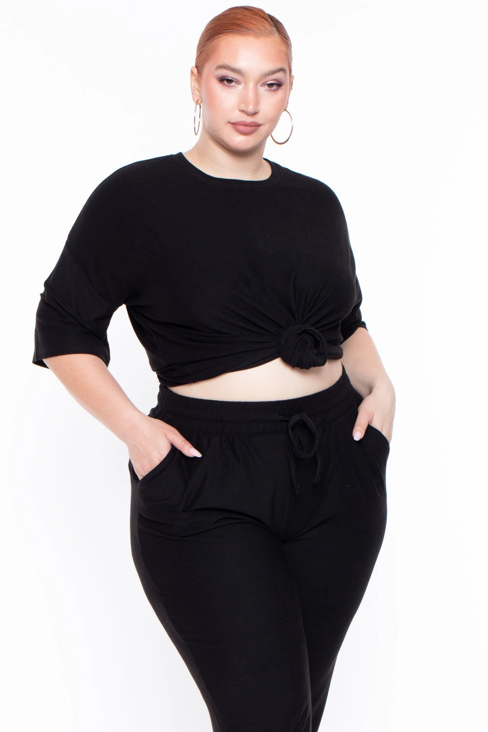 This plus size, lounge set is casual and effortless. Dee features lightweight material, crew neck, short sleeves and the pants have an elastic waistband with adjustable drawstrings, and pockets.