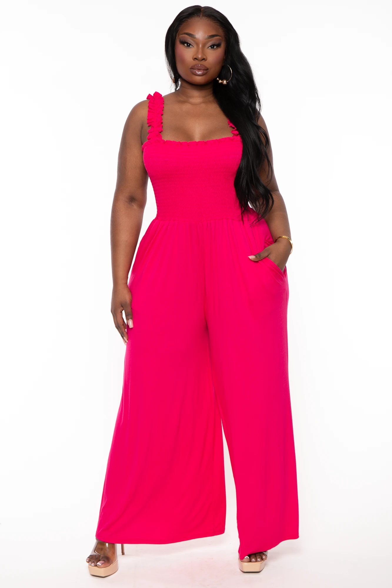 This plus size, stretch knit romper features a straight neckline, ruffle detail straps, smocked top, wide legs bottom with pockets
