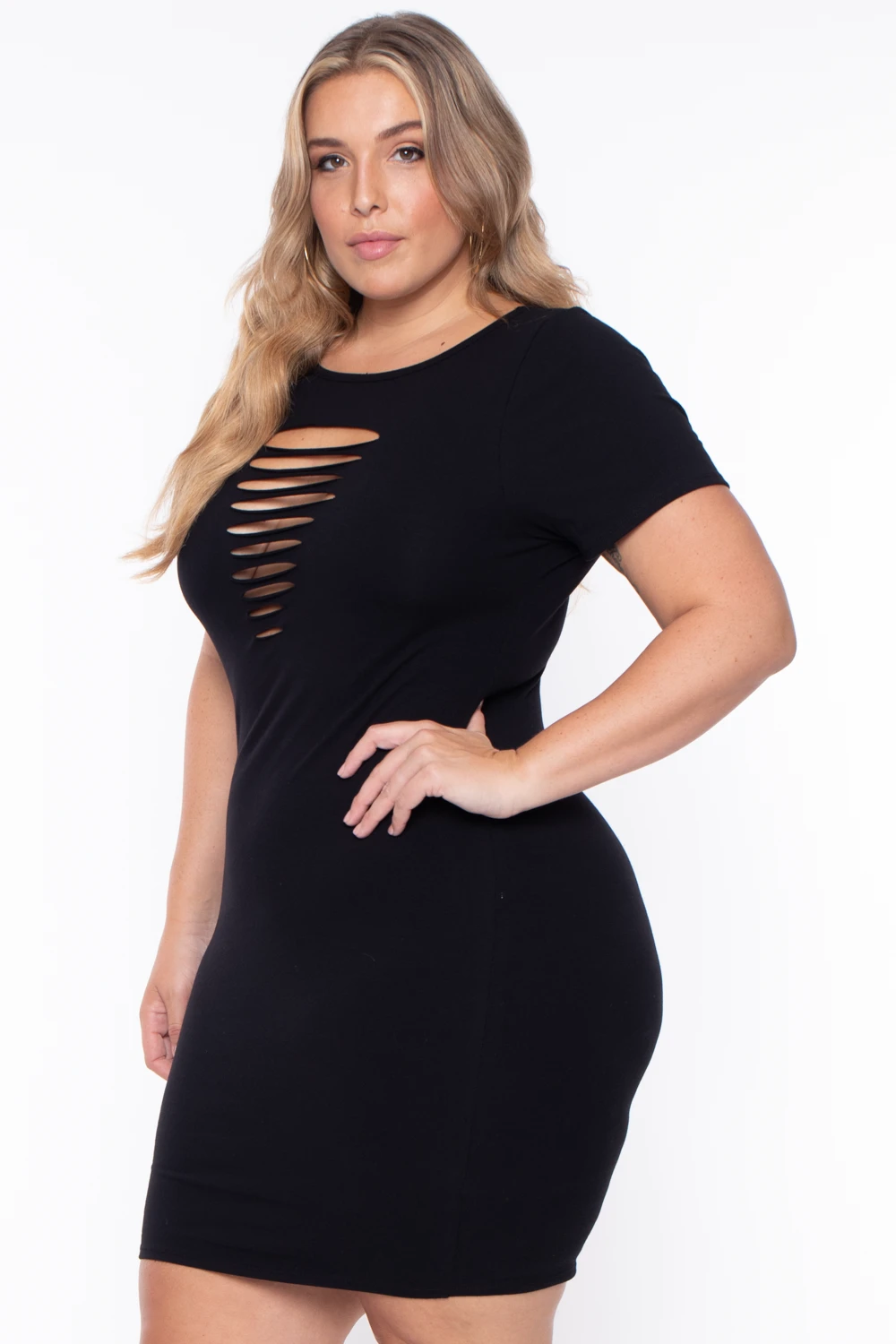 This plus size, extra stretch knit dress features a round neckline, short sleeves, a destroyed front detail, and a bodycon silhouette super cute sexy and comfy