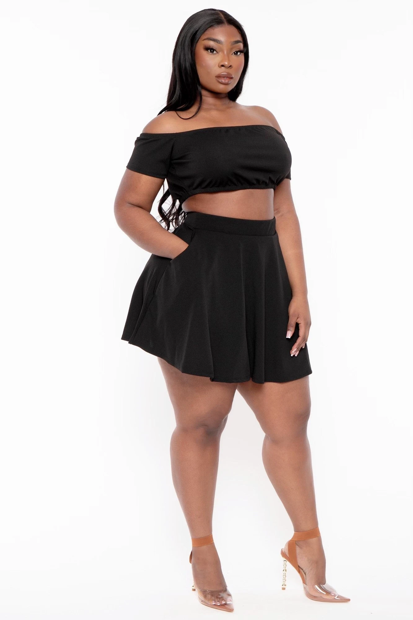 This plus size, stretch-woven top and skirt set feature an elasticized off-shoulder top with short sleeves, and elasticized waist hem, the skirt has an elastic waist, side pockets and mini flared length