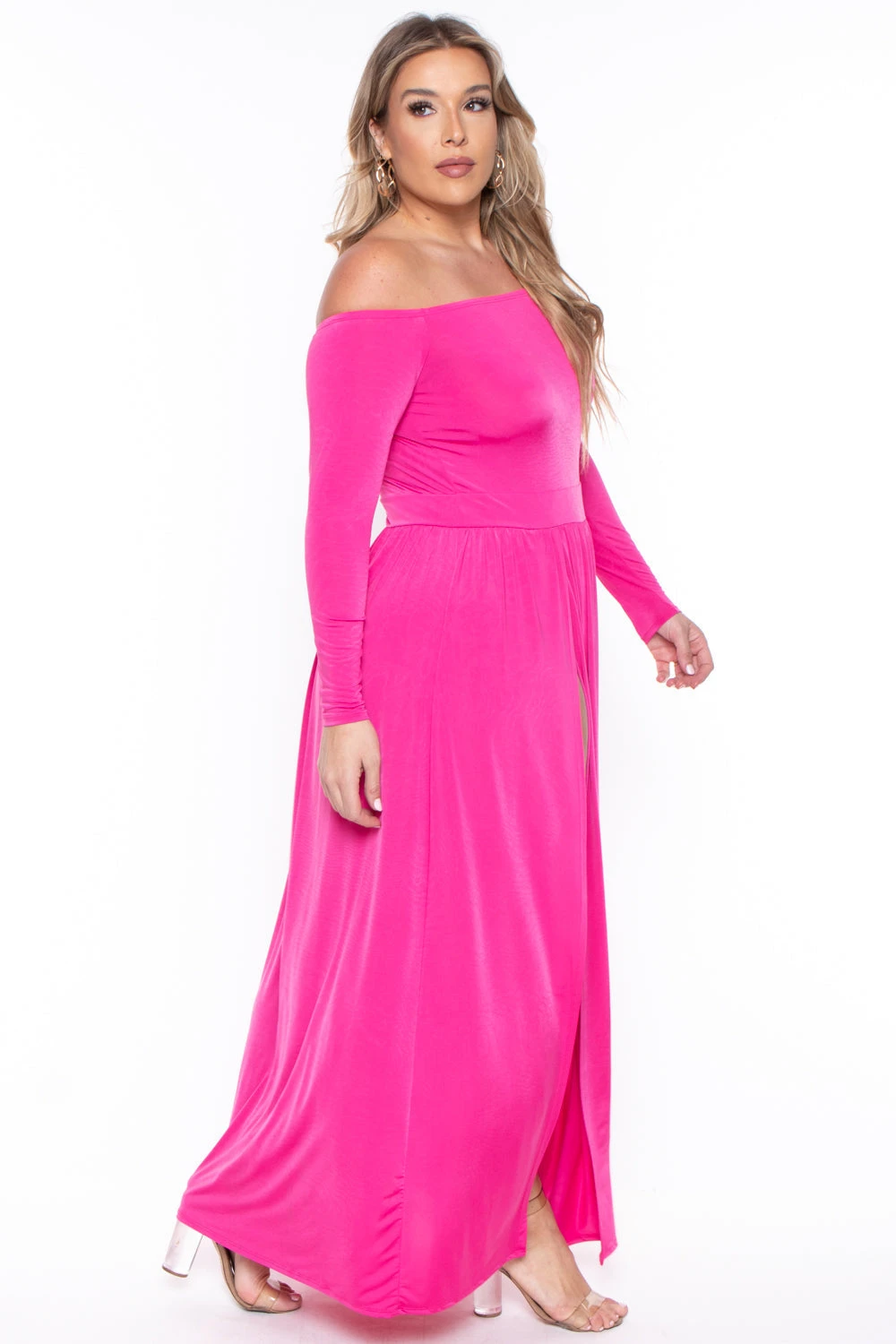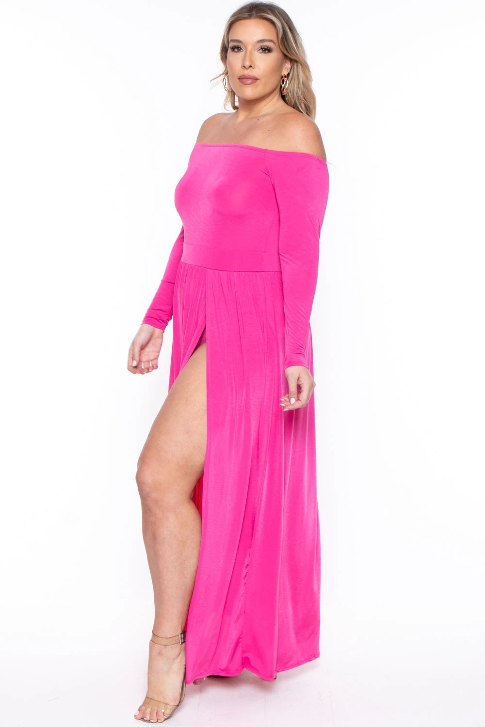 This plus size, stretch maxi dress features an off the shoulder neckline, long sleeves, attached bodysuit, and a dramatic front M-slit.