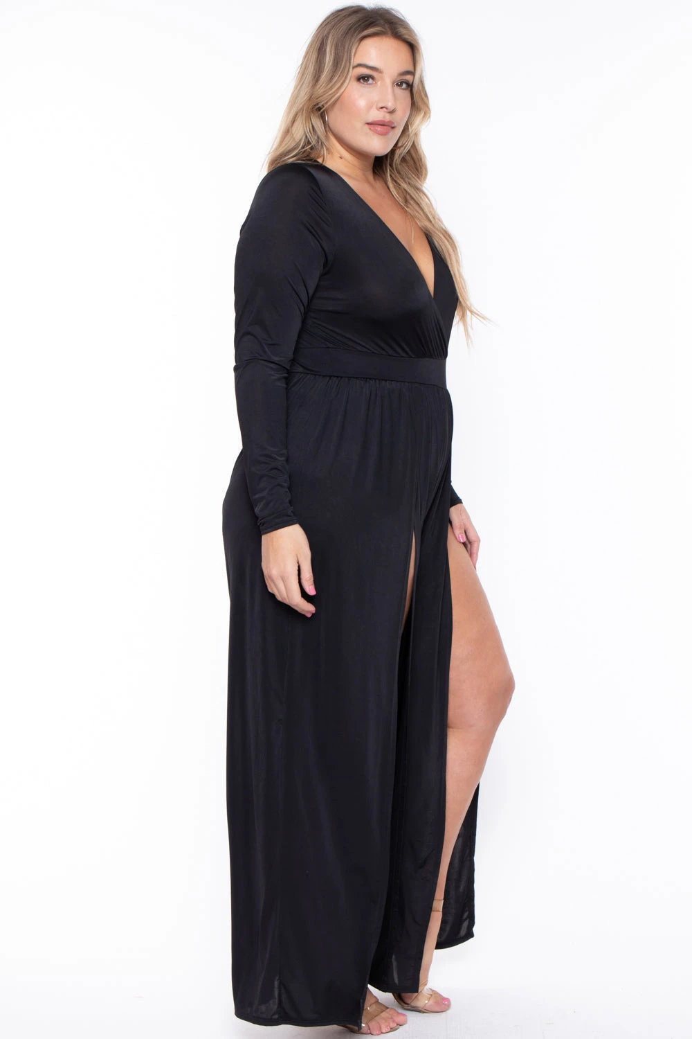 This plus size, jumpsuit features the m-slit design, long sleeves, and a deep v neckline