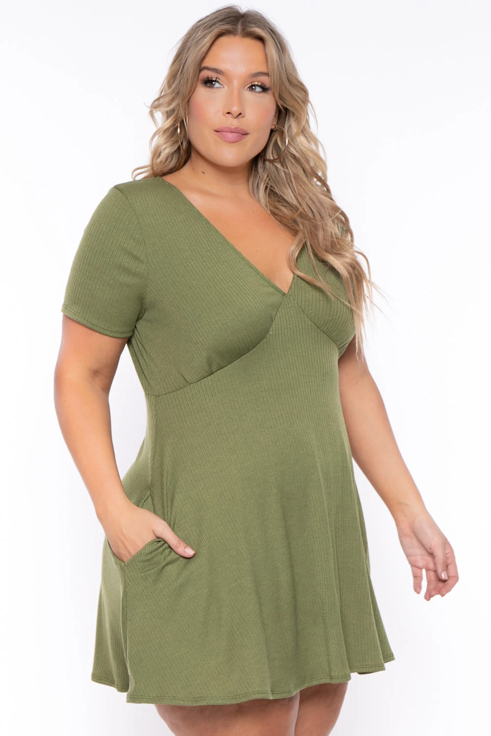 This plus size, dress features an A-line flare silhouette that floats away from the body, deep V-neckline and comfortable lightweight rib knit material. Perfect basic dress to add to your wardrobe.