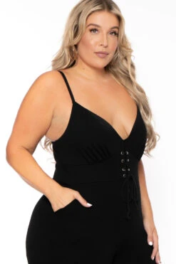 This plus size, stretch knit jumpsuit features a sleeveless design, a v-neckline with adjustable straps for and added comfort, contrast binding, a smocked design detail at bust, a tapered skinny leg with an elasticized rib knit binding at bottom hem.