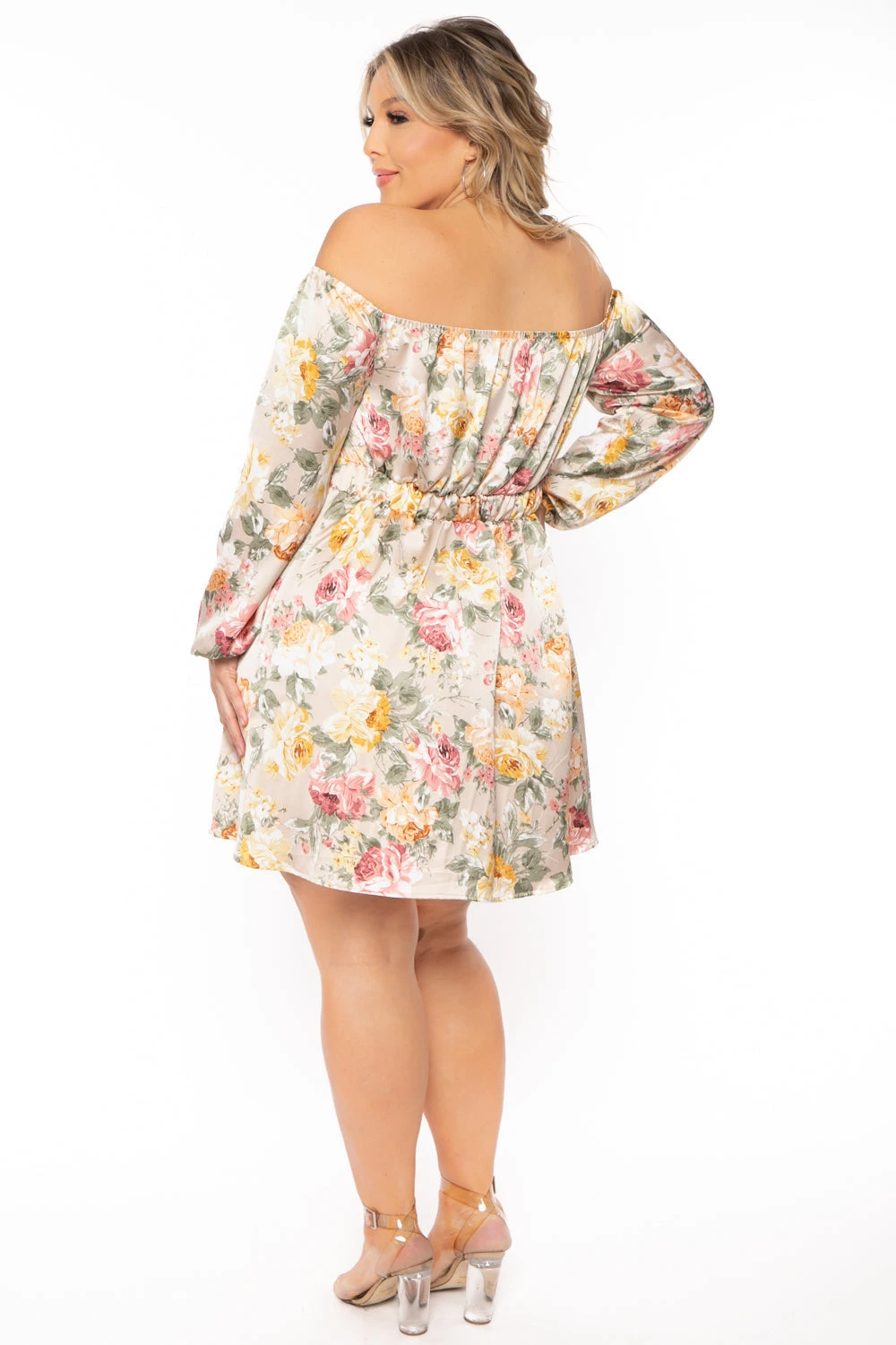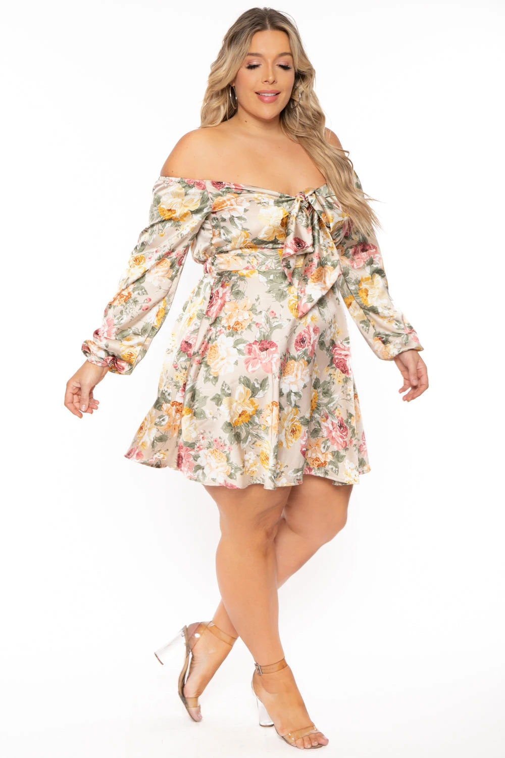 This plus size flair dress features an all over floral print, front tie key hole detail, off the shoulder neckline, long sleeve, elasticized waistline in a flowy mini length sillouhete.