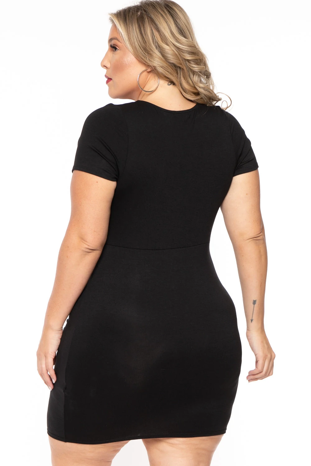 This plus size, surplice dress features a sexy v-neckline, short sleeve, front ruching, front draped panel.
