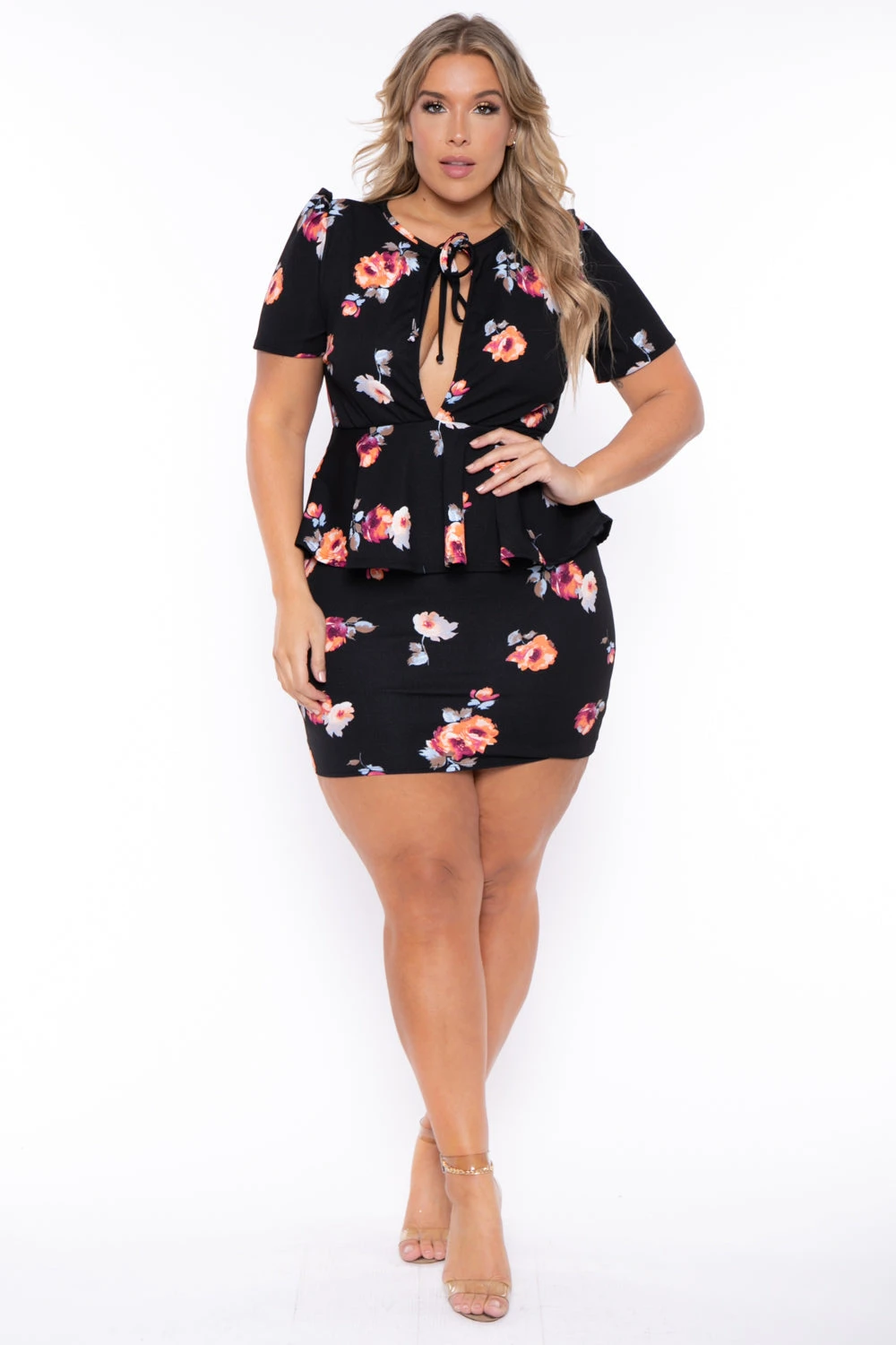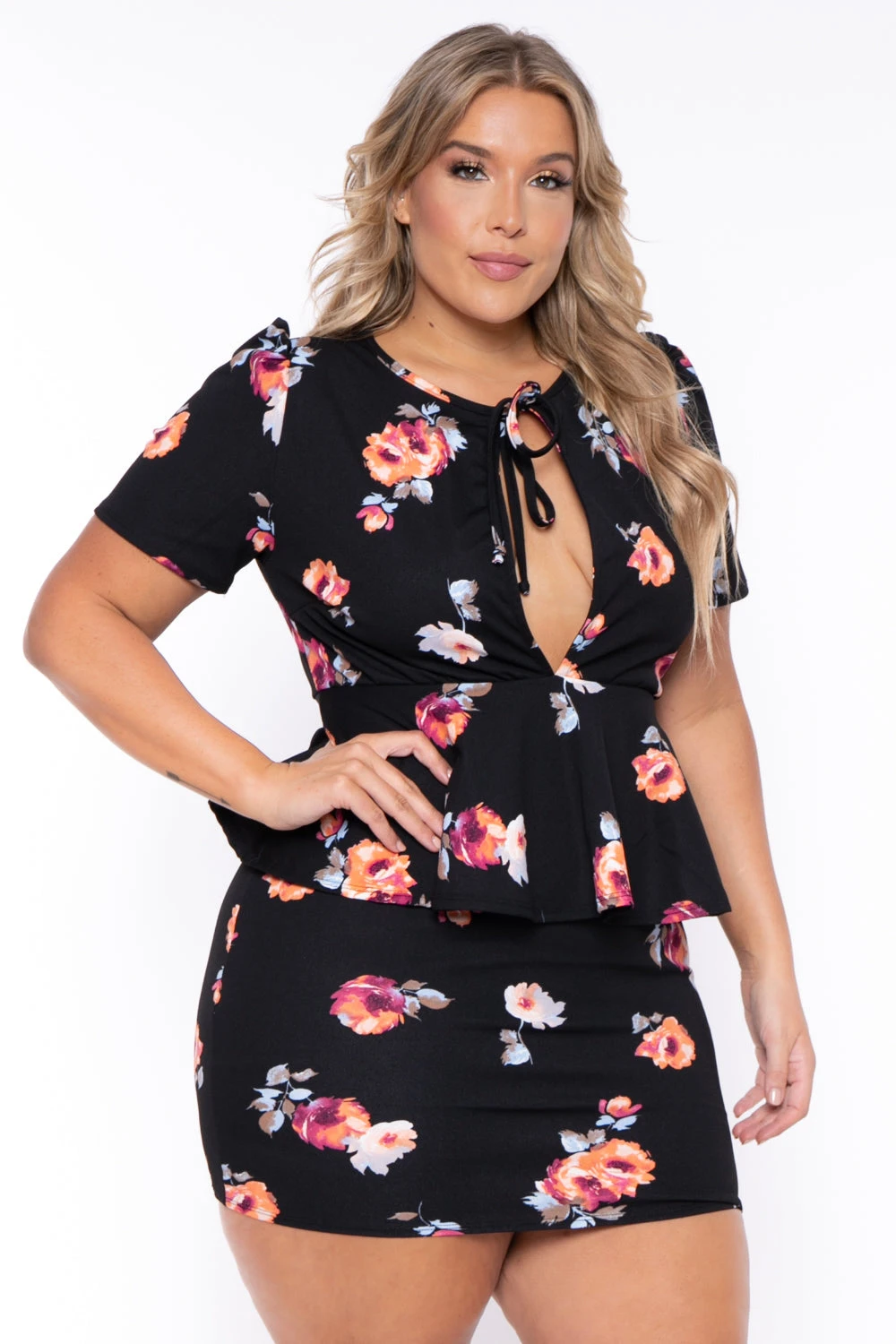 This plus size, Peplum dress stretch dress features a round neckline with a front plunging neckline bow tie closure, short gathered sleeves elasticized peplum at waist, and a straight hem and a floral print all over