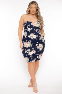 This plus size, bodycon dress features an all over floral print a deep plunging v-neckline with an added wire in fabric for durability, top contrast leopard print, strapless with side pockets, and bodycon fitted style also back hem slit