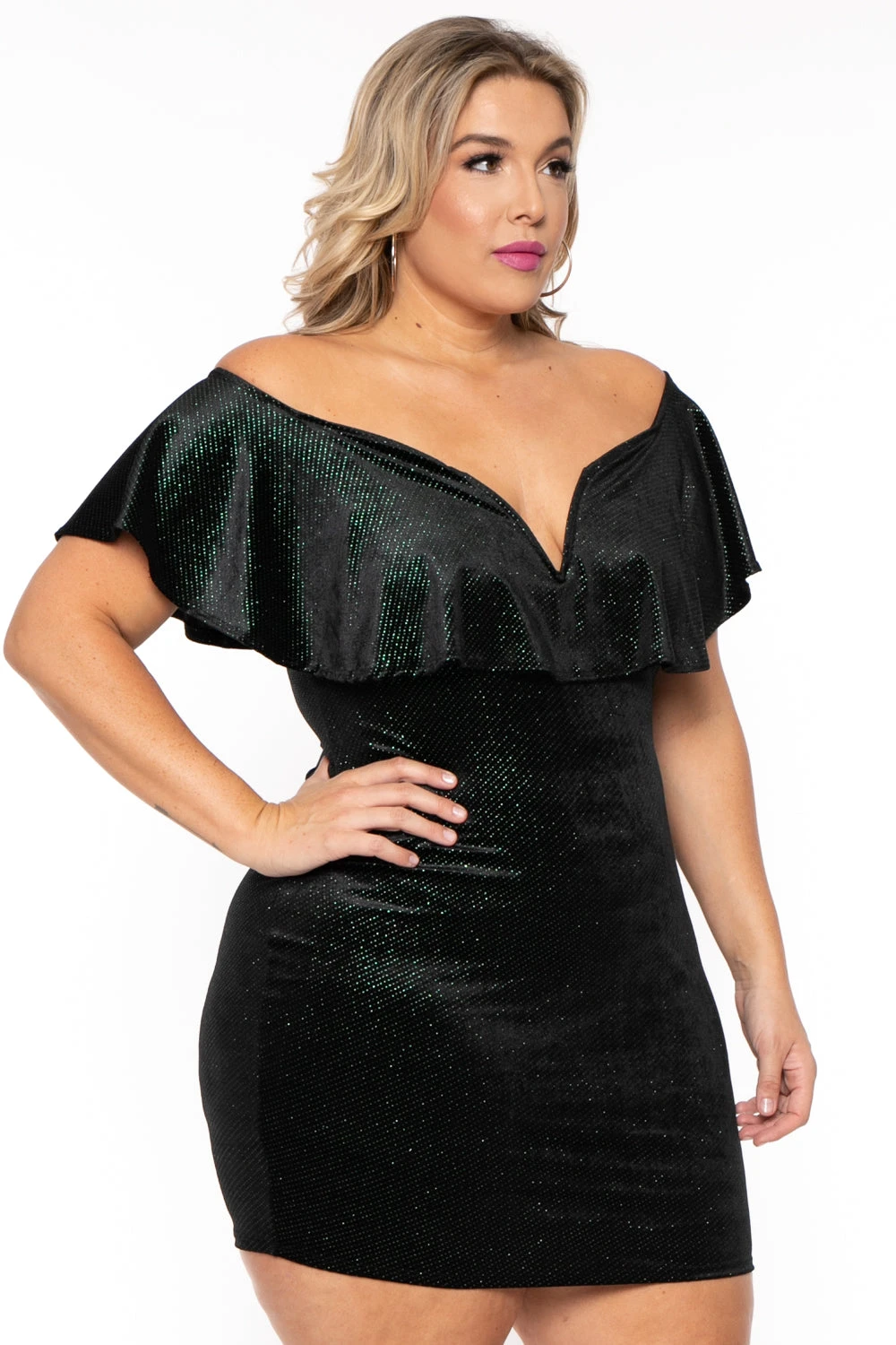 This plus size, glitter velvet dress features a deep plunging v-neckline with an added wire in fabric for durability, off-the-shoulder frill ruffle detail, and side seams for a more fitted style.