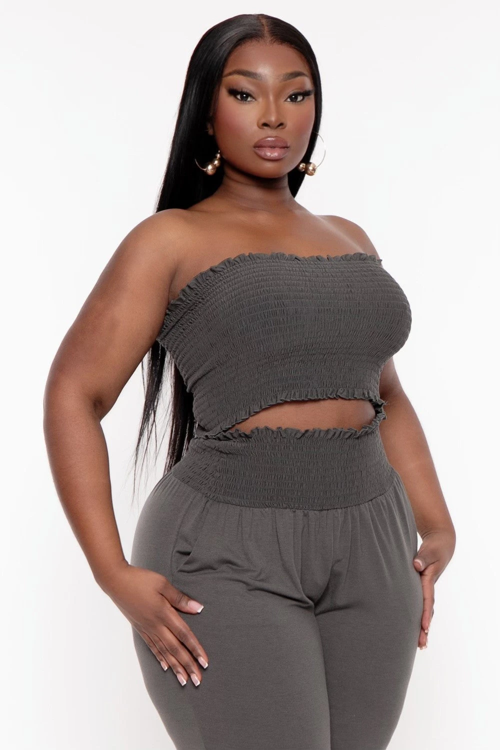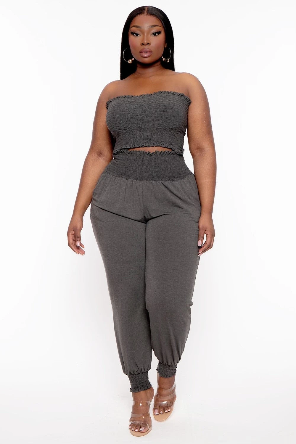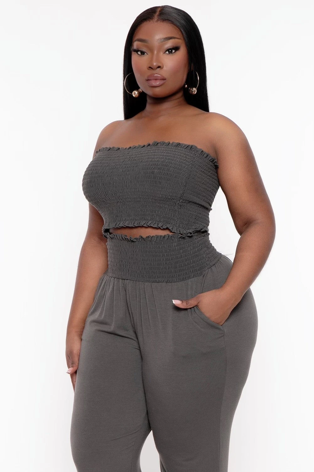 This plus size, matching lounge set features a smocked tube top matching pants with a smocked waistband, front pockets, Style it how you want cozy and casual or add a little style!