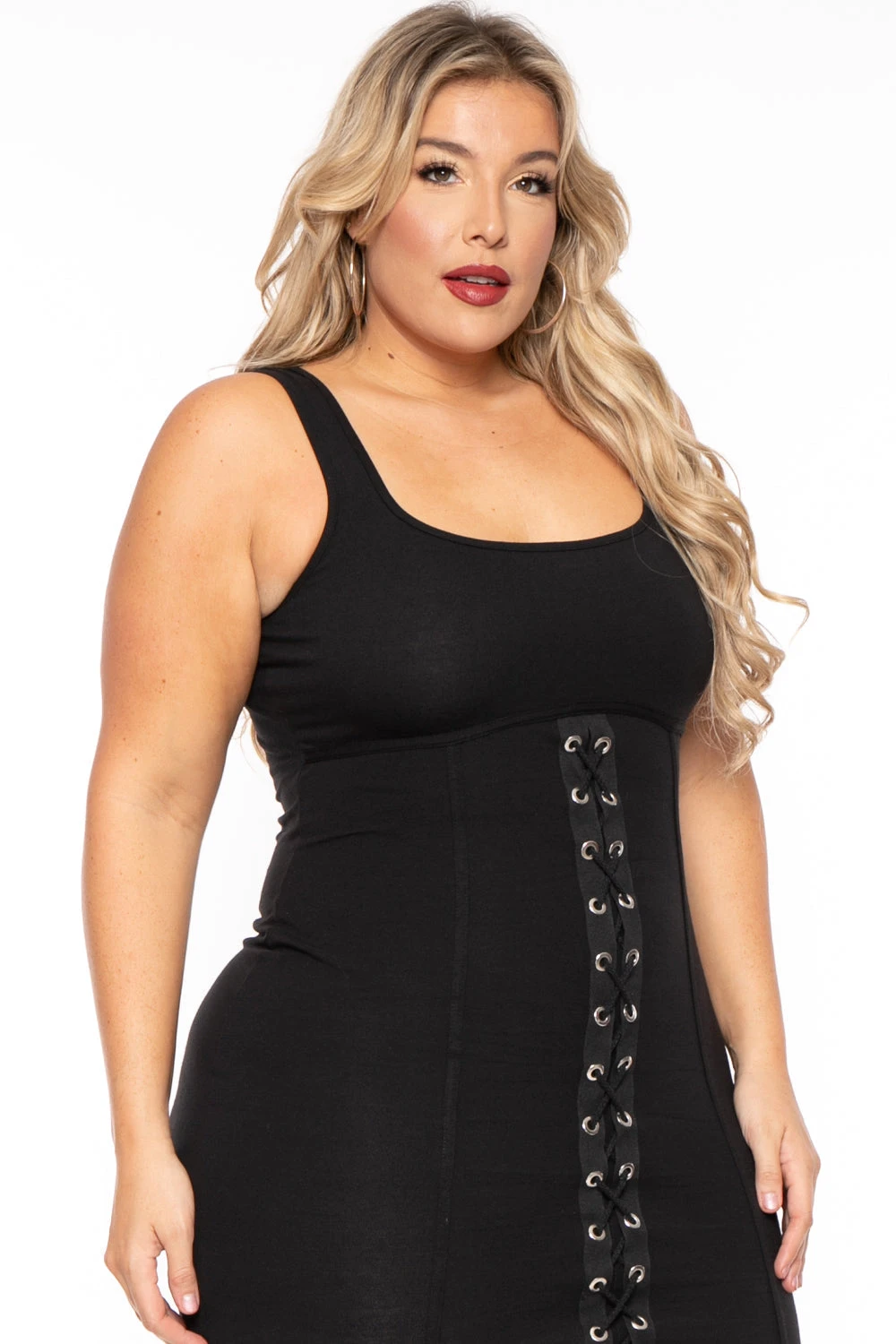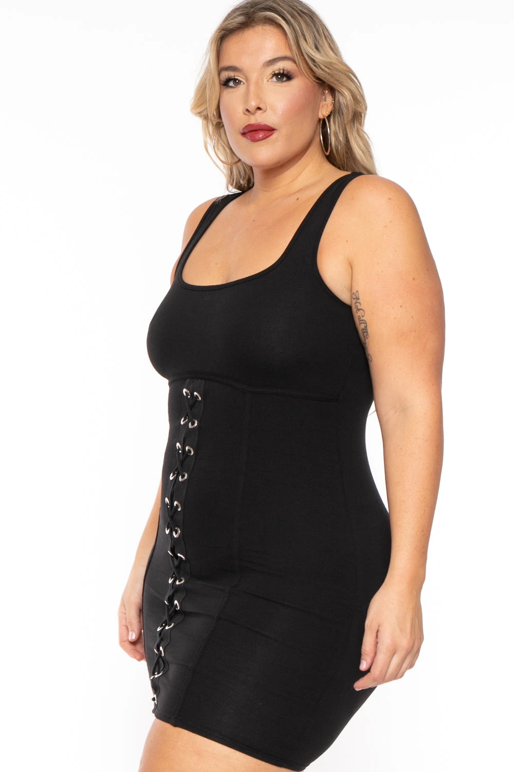 This plus size, stretch knit dress features a scoop neckline, sleeveless, grommet lace up detail, and mini length bodycon sillouhete.