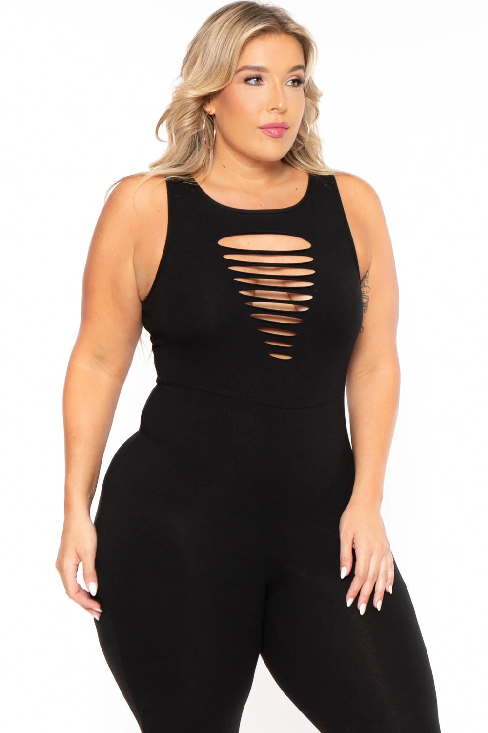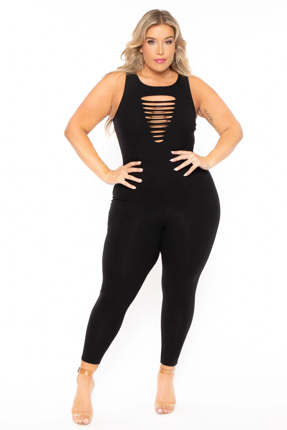 This plus size, stretch knit jumpsuit features a round neckline with a back keyhole, destroyed front detail, sleeveless cut, and a skinny leg