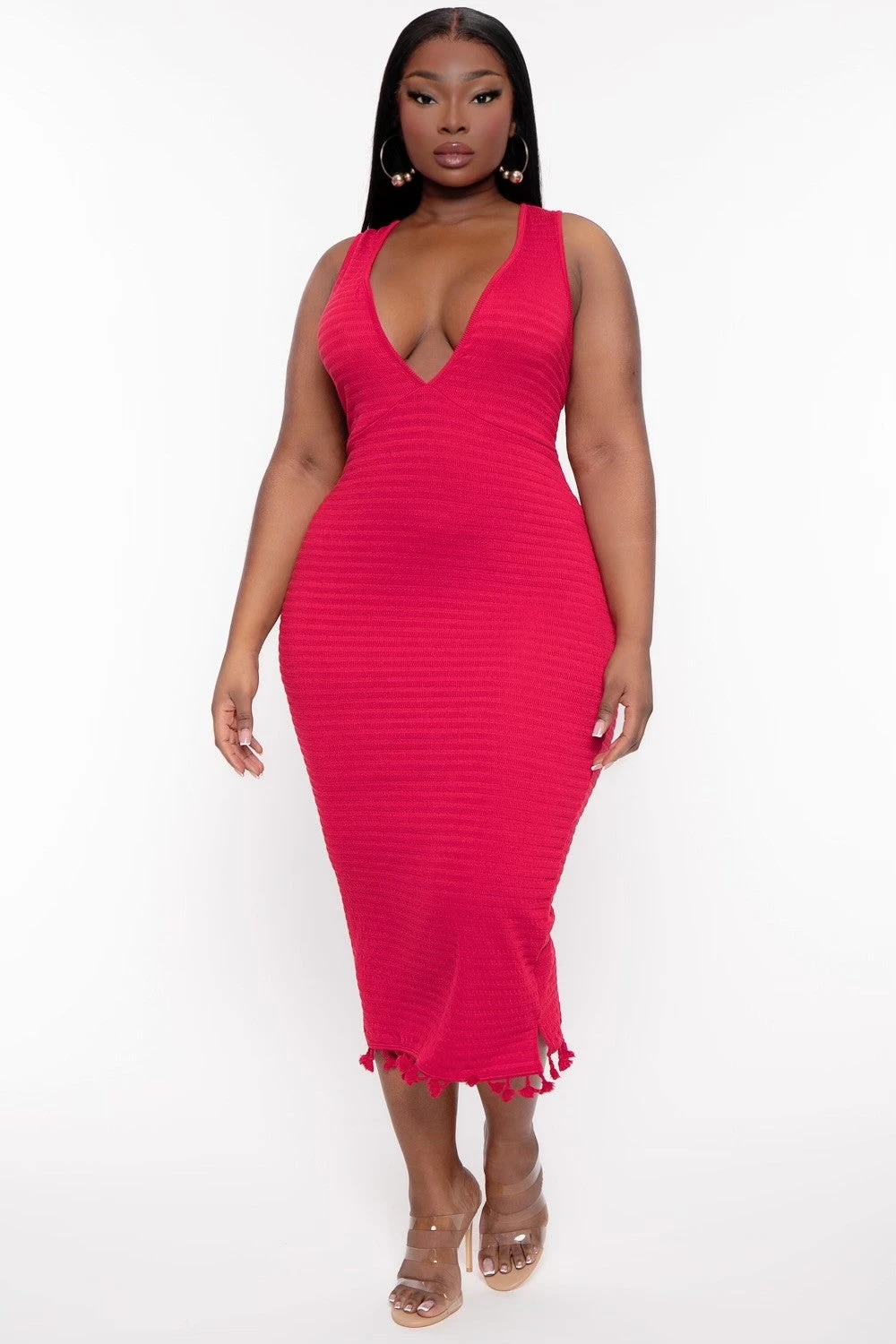 This plus size, stretch dress features textured ribbed fabric, a plunging v-neckline, sleeveless, small side slits, all around pop pom at the hem,