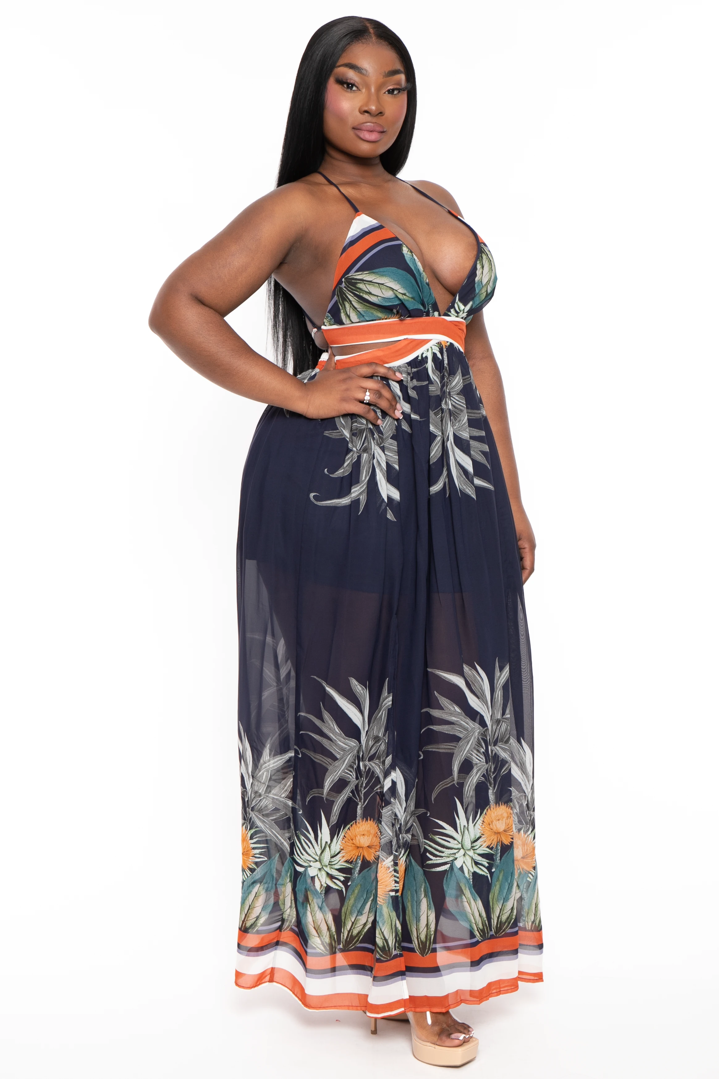 This plus size chiffon dress features a border print, surplice v-neckline, cut out detail at the waist, sleeveless, an open crisscross back with a tie-back strap, back zipper with hook and eye closure, partial lining, and an m-slit and a maxi length